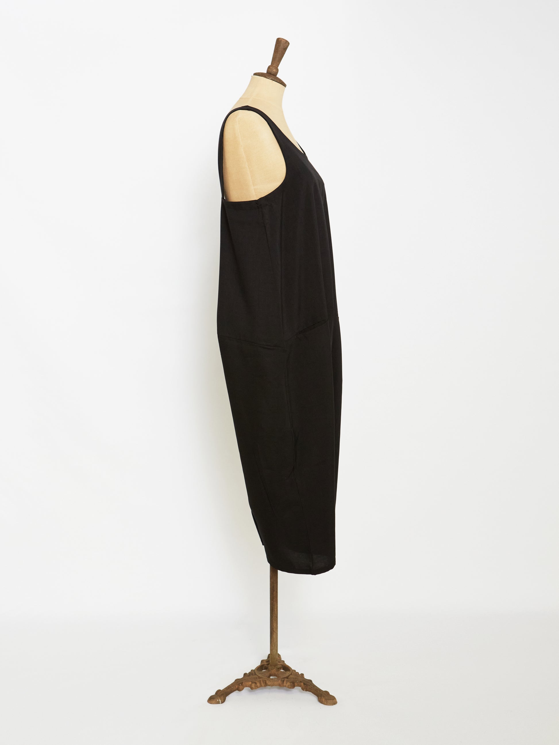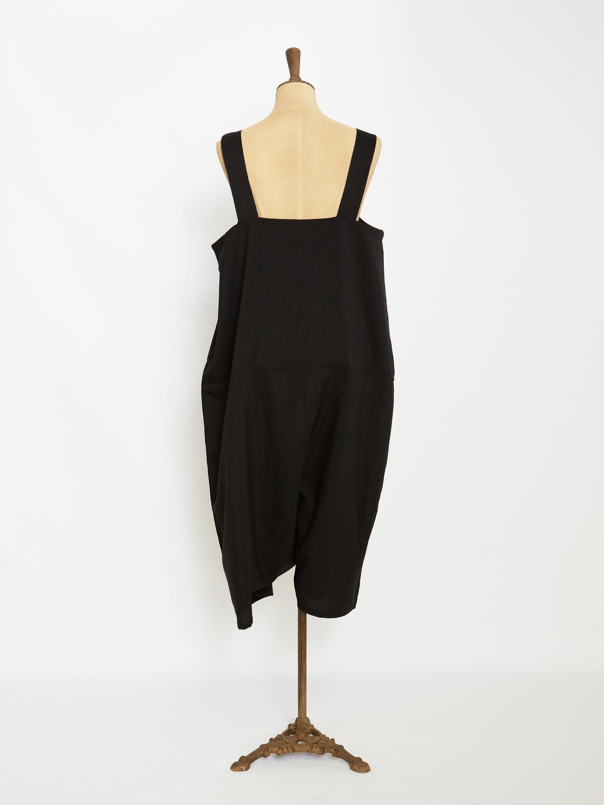 Crafted from pure linen for a breathable finish in black, this relaxed fit overall features a baggy pants for volume and adorable style without sleeves for a laid-back silhouette. The front pockets and cutting line elevate this style.