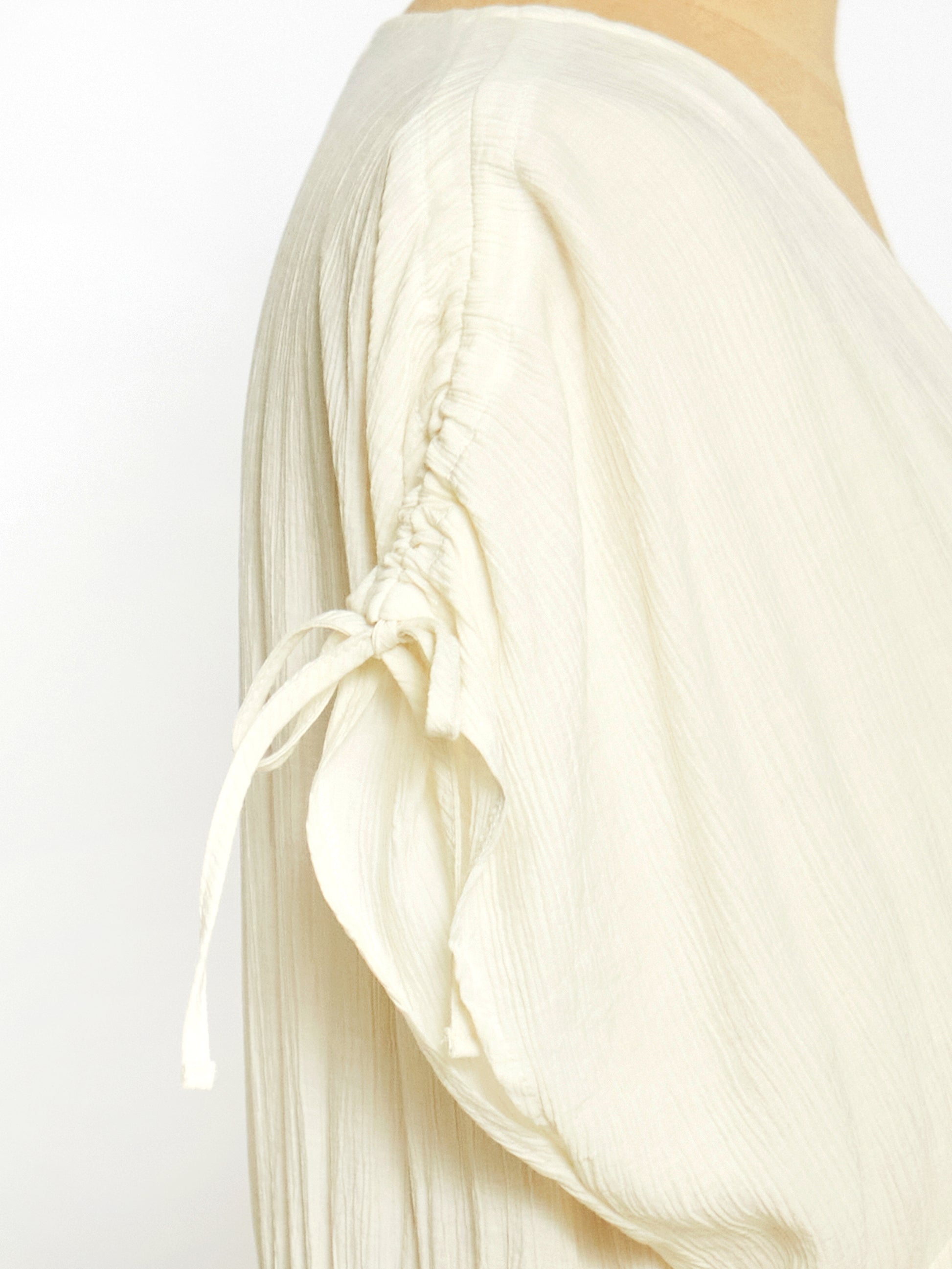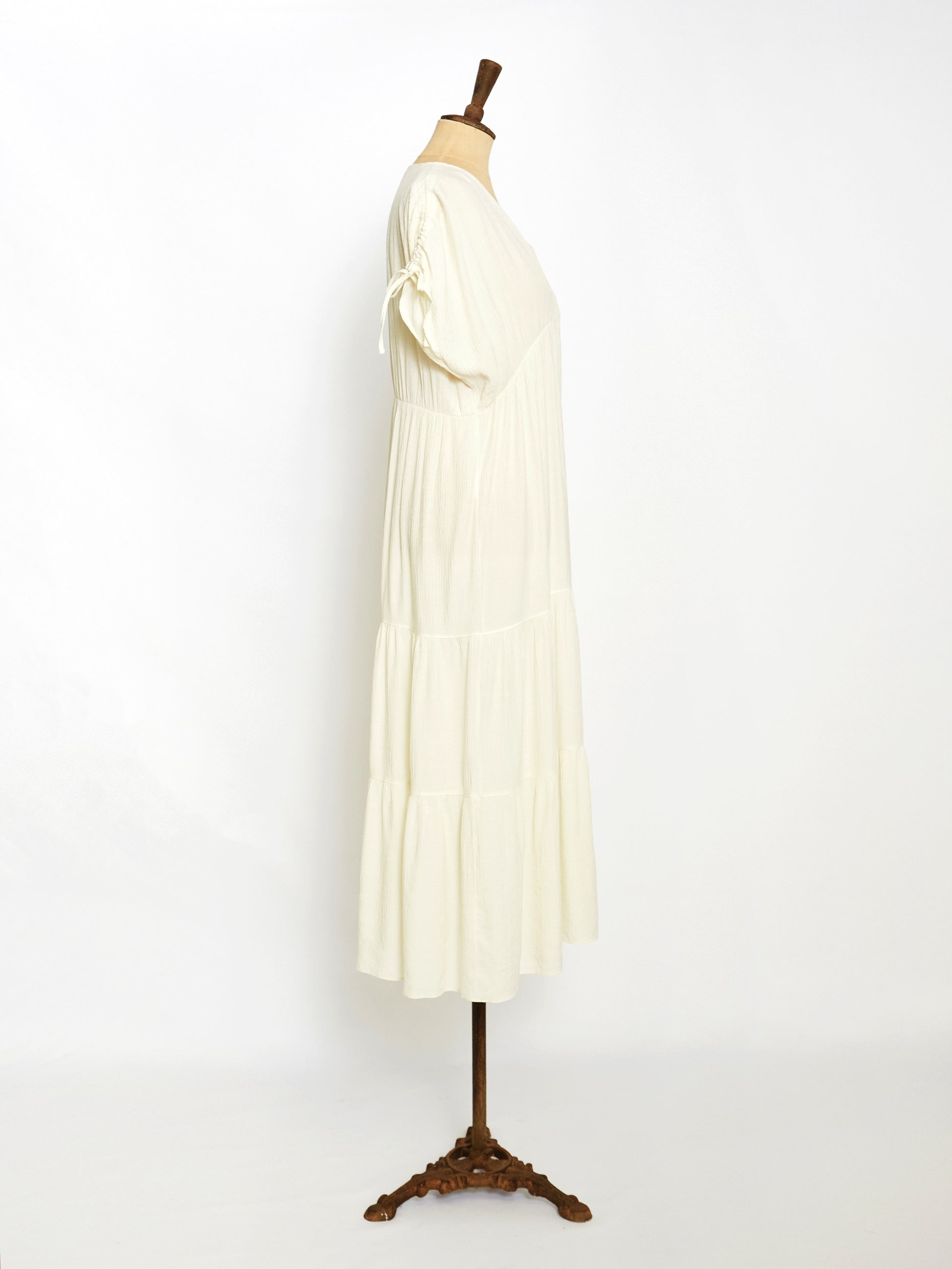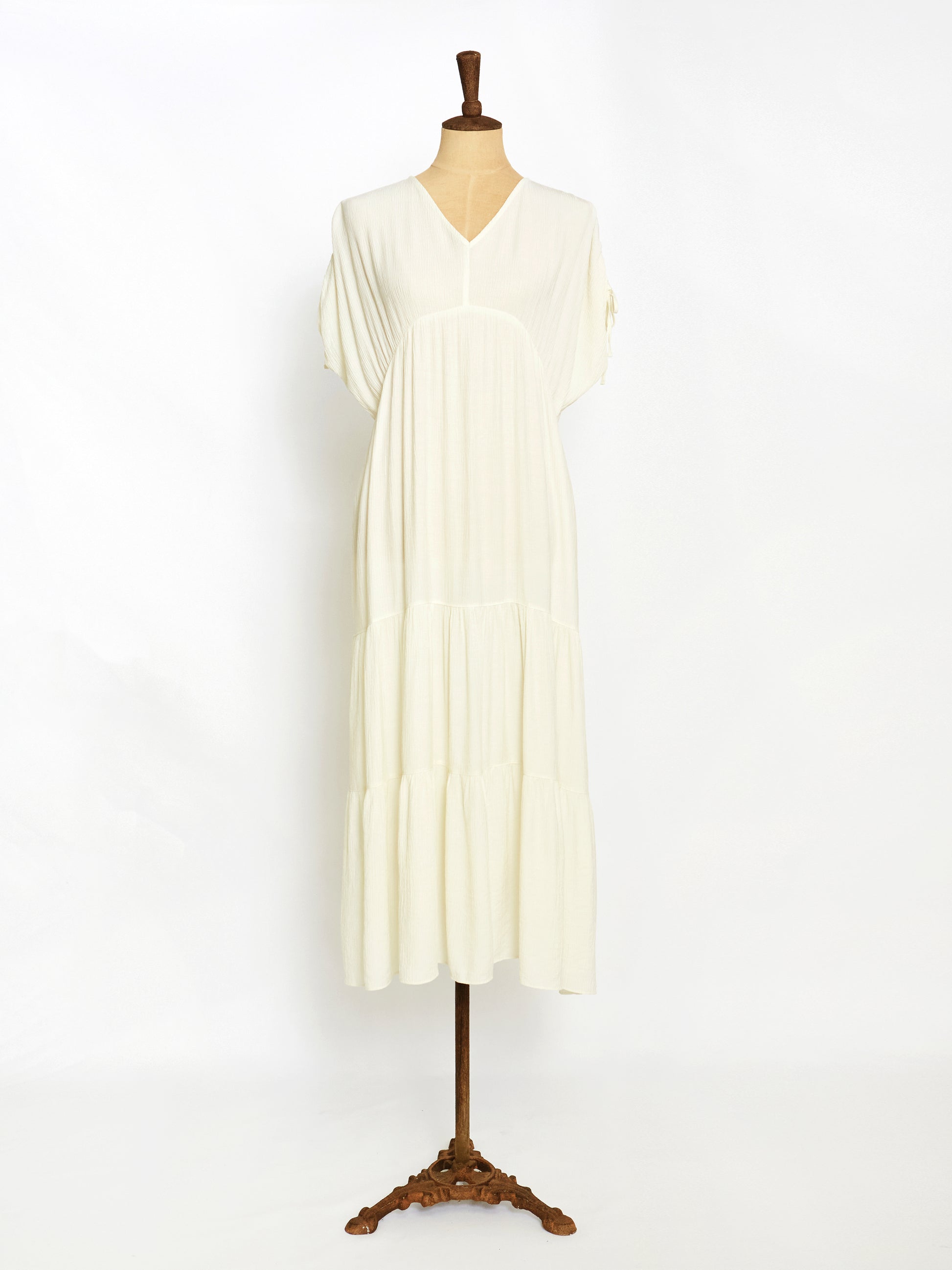 Crafted from rayon fabric for a breathable finish in ivory, this regular fit dress features a flare dress with pleats for volume and gypsy style with the gathering shoulder for a laid-back silhouette. The sleeves string elevates this style and adjustable.
