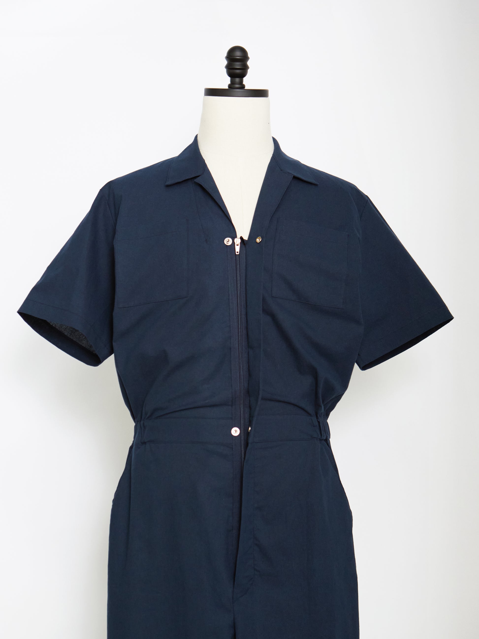 Crafted from pure cotton for an edge finish in navy, this standard fit jumpsuit features a waist band with zipper and snaps for fit and stylish silhouette. The front pocket and camp collar elevate this style.