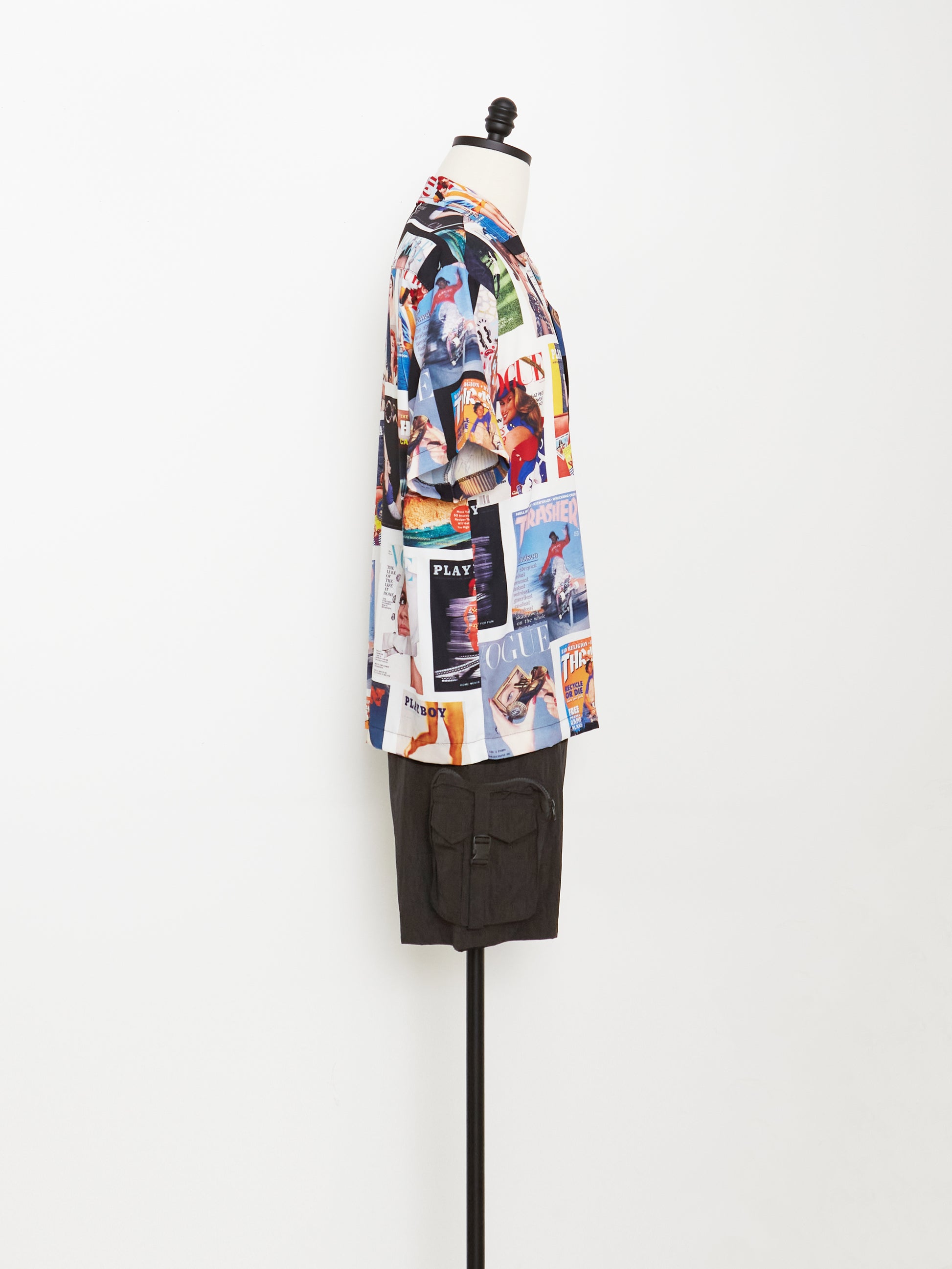 Crafted from light fabric for a breathable finish in magazine covers pattern, this standard fit summer shirt features camp collar for a laid-back silhouette.