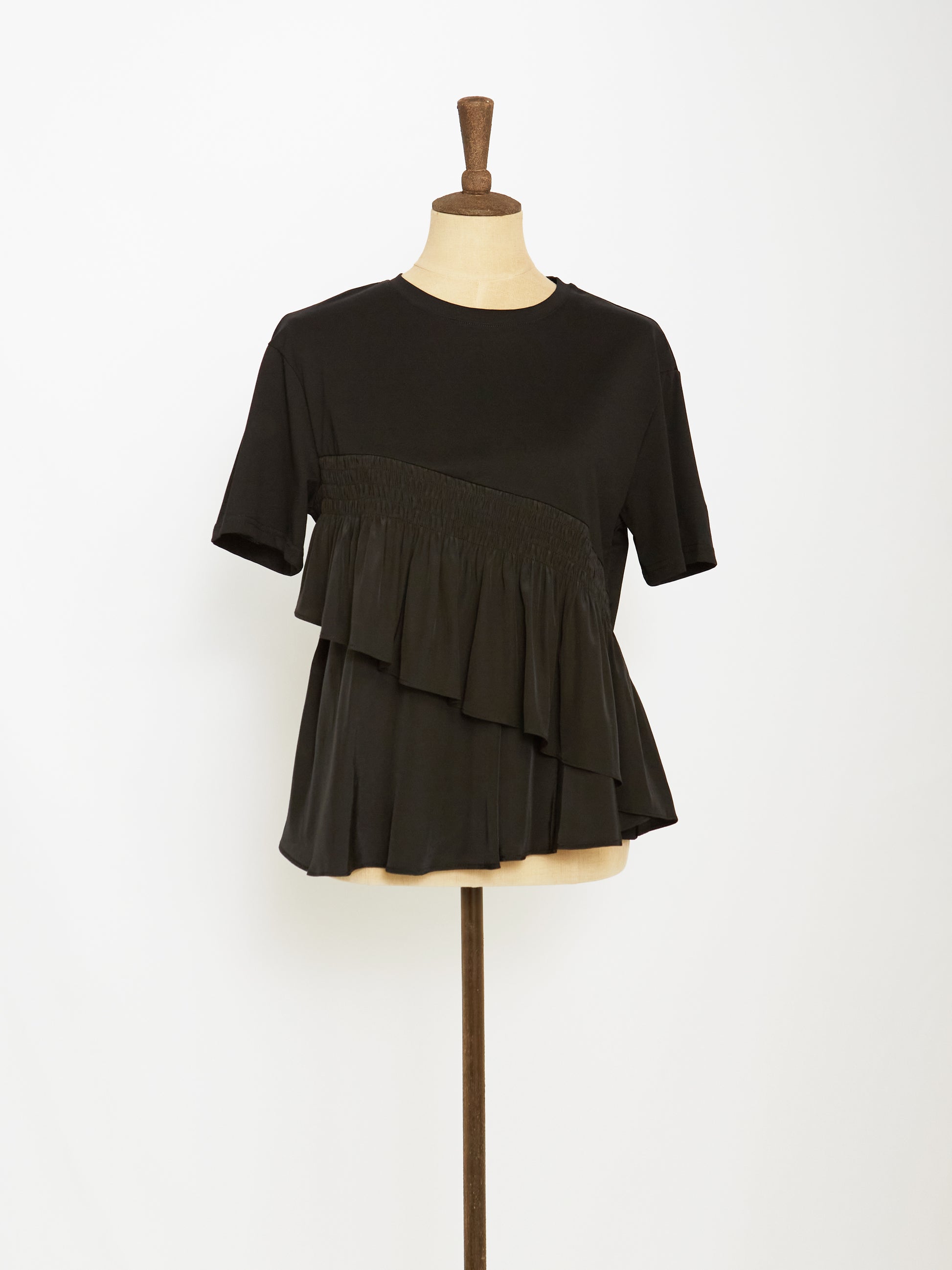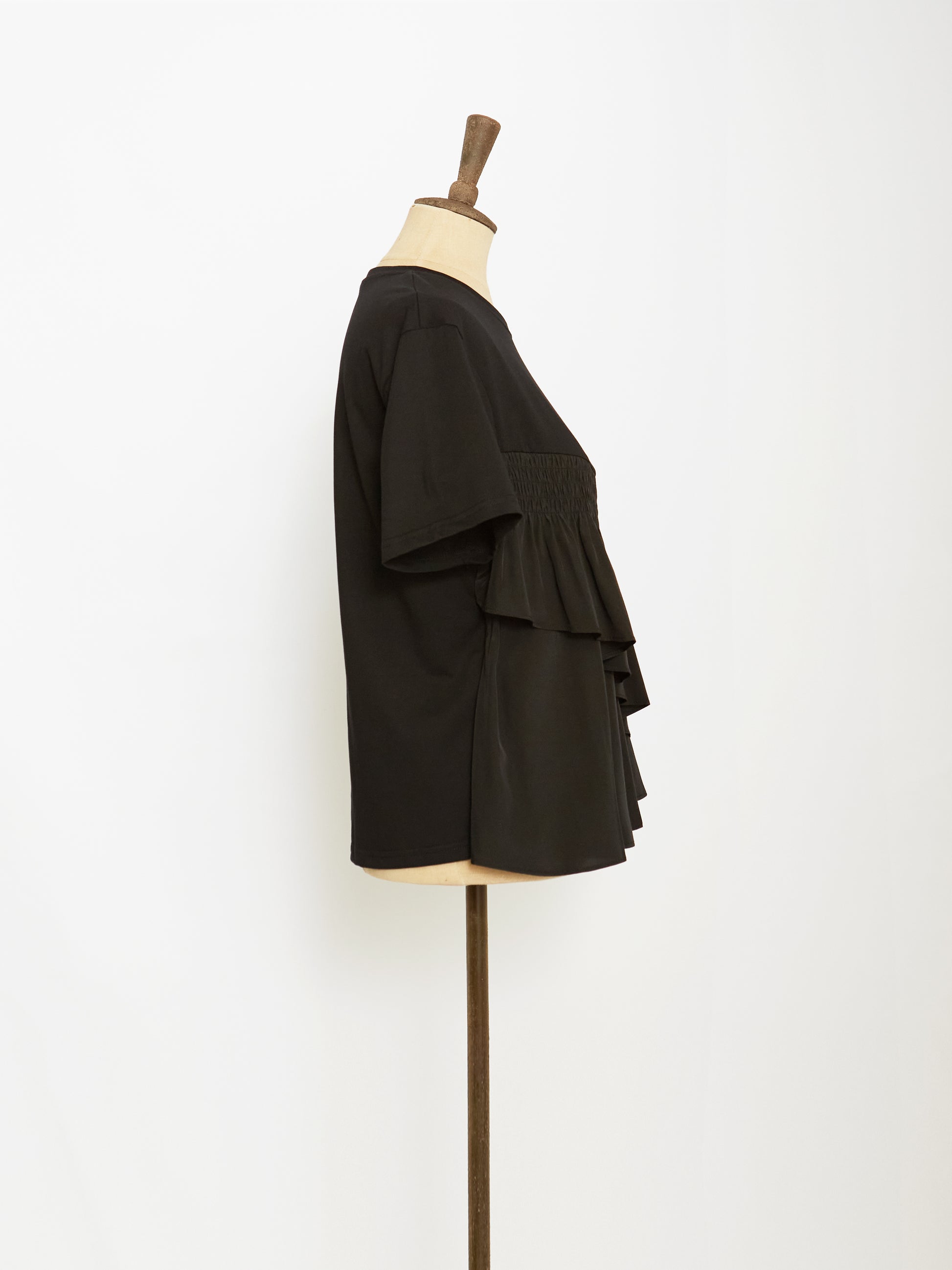 Crafted from polyester and rayon blended fabric for a breathable finish in timeless black, this regular fit top features a flare and gathering at the front for volume and unique style with short sleeves for a simple silhouette. The different texture of attached part flare elevates this style.