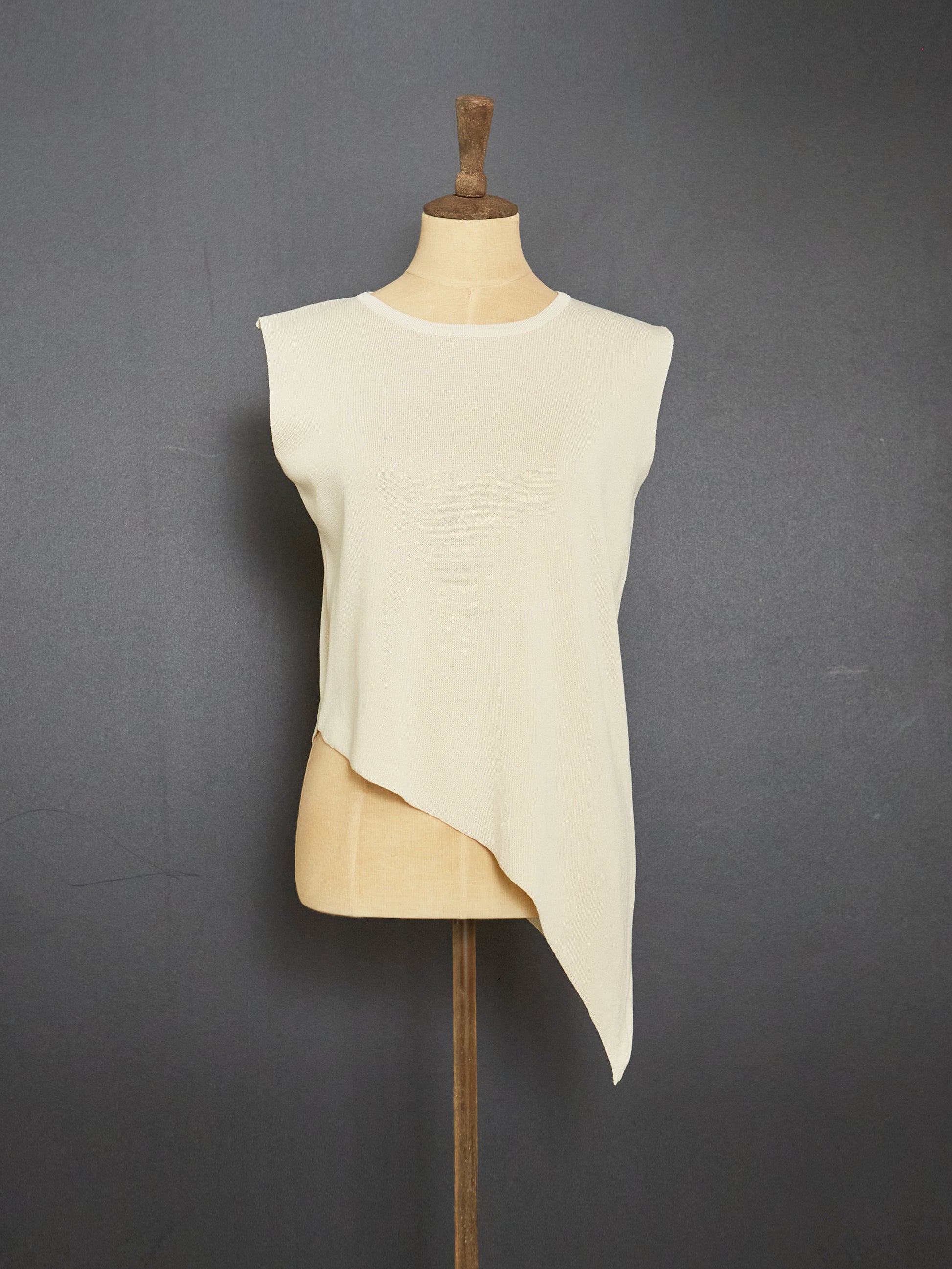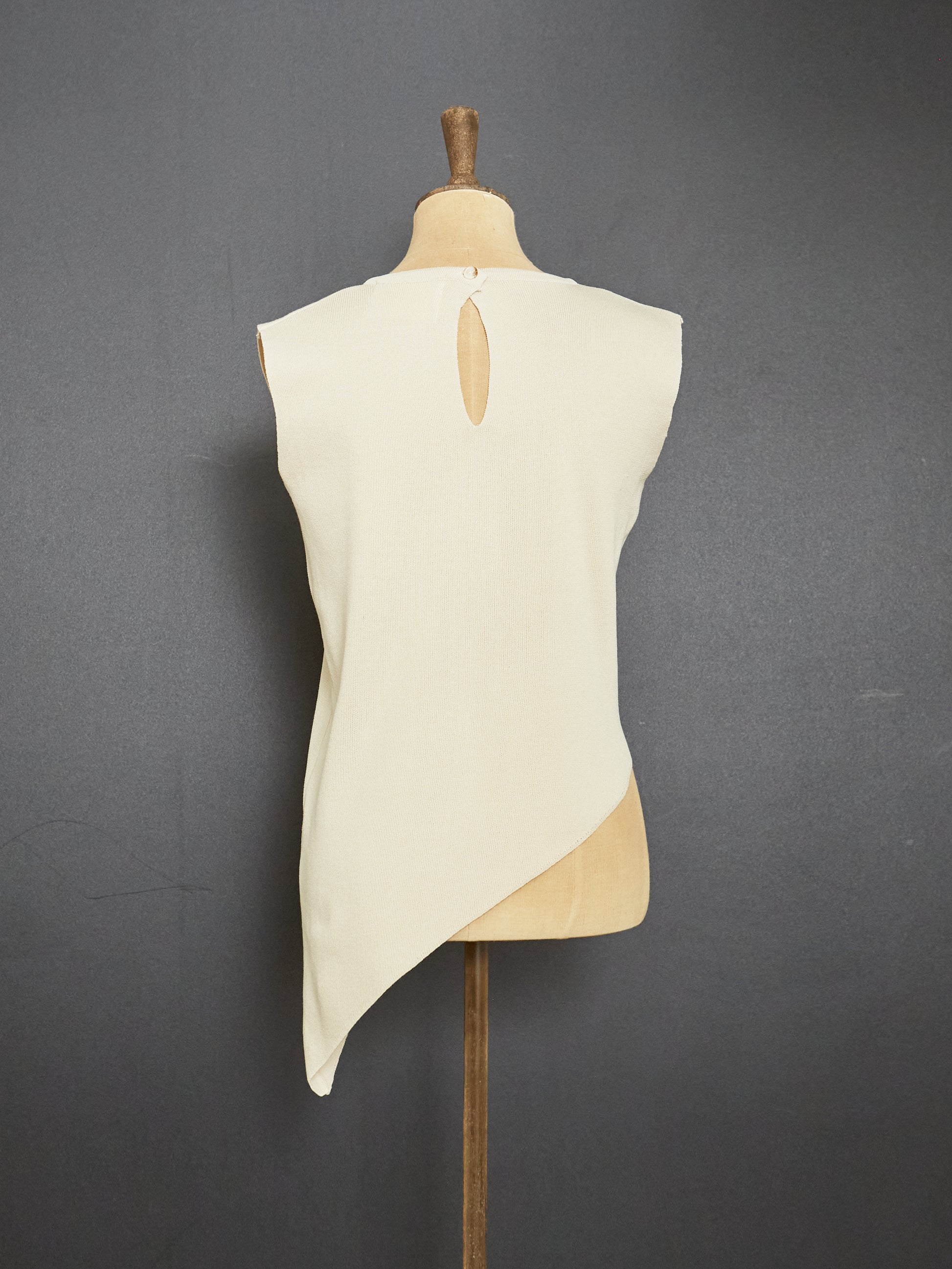 Crafted From Viscose Fabric For An Edge Finish In Ivory, This Unbalance Fit Top Features A Asymmetrical Hem Line For A Stylish Silhouette. The Back Button Detail Elevates This Style.