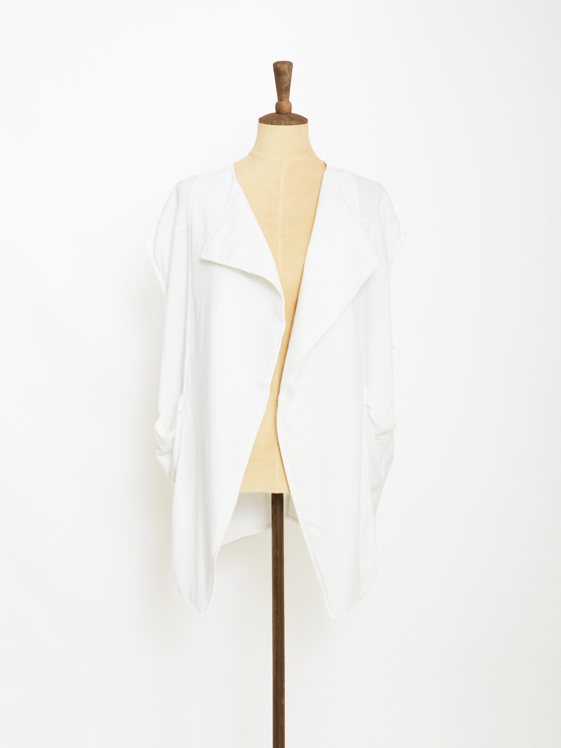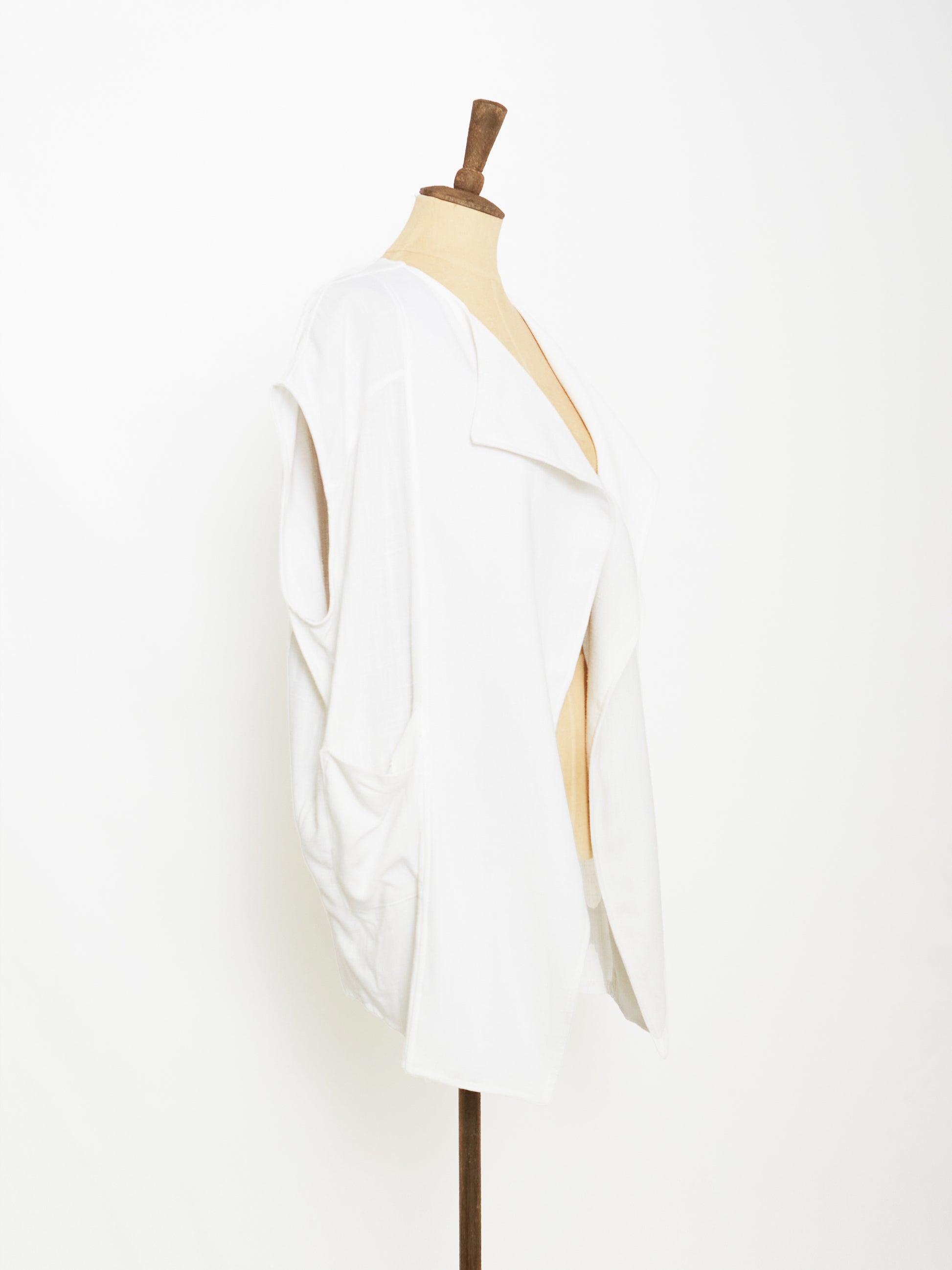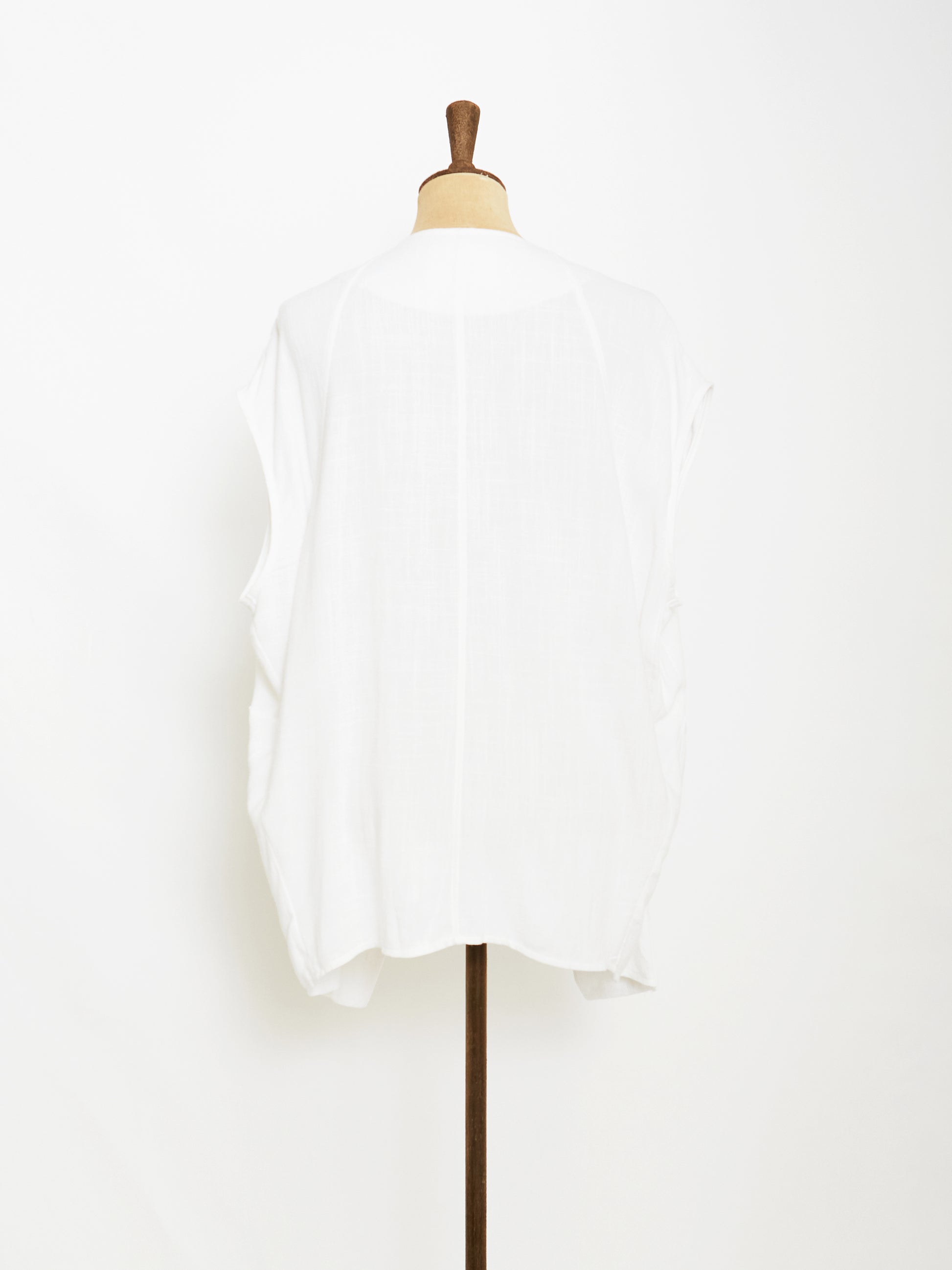 Crafted From Blend Linen For A Breathable Finish In Timeless White, This Drapery Fit Vest Features An Unbalanced Cut Hem Line For Volume Style Without Sleeves For A Laid-Back Silhouette. The Side Volumed Pockets And Plain Collar Elevate This Style.