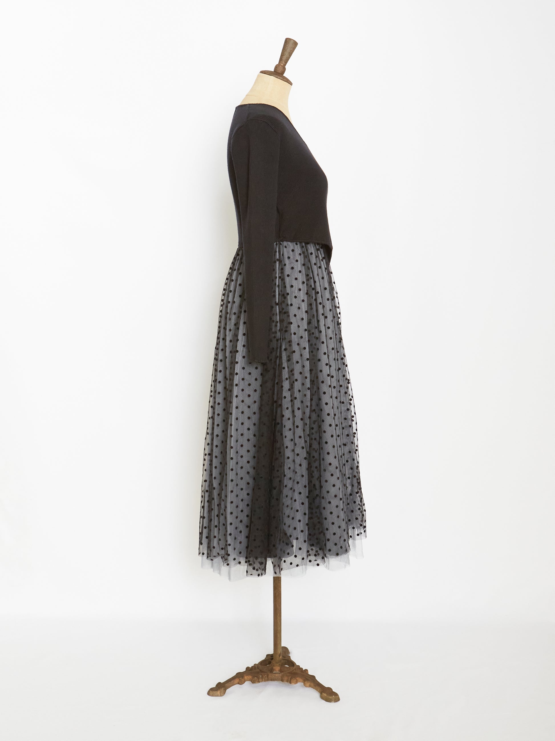 Crafted from blended fabric for an edge finish in black, this regular fit tulle dress features wrap knit top with v neck and polka dot tulle skirt for a simple but unique style. The light gray skirt under see-through black tulle skirt elevates this style.