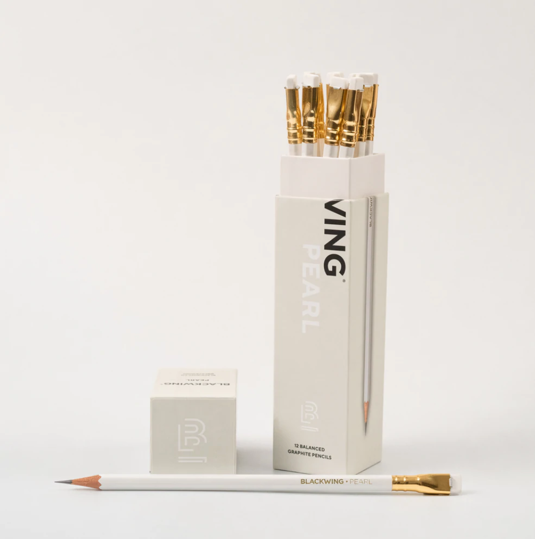 A favorite of calligraphers and illustrators, the Blackwing Pearl includes a balanced and smooth graphite core that is softer than the graphite found in the Blackwing 602, but firmer than the graphite found in the Blackwing Matte. Each pencil features a classic pearl white finish, iconic square Blackwing ferrule and white eraser.