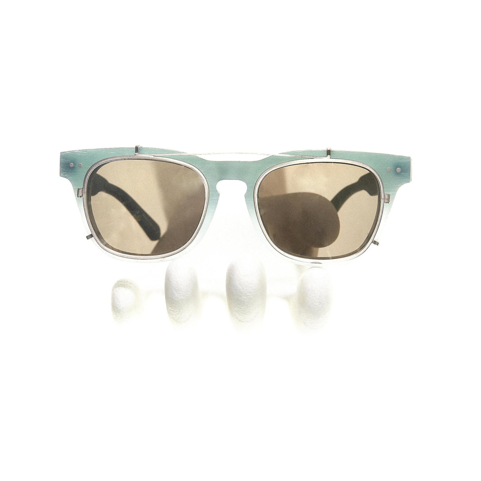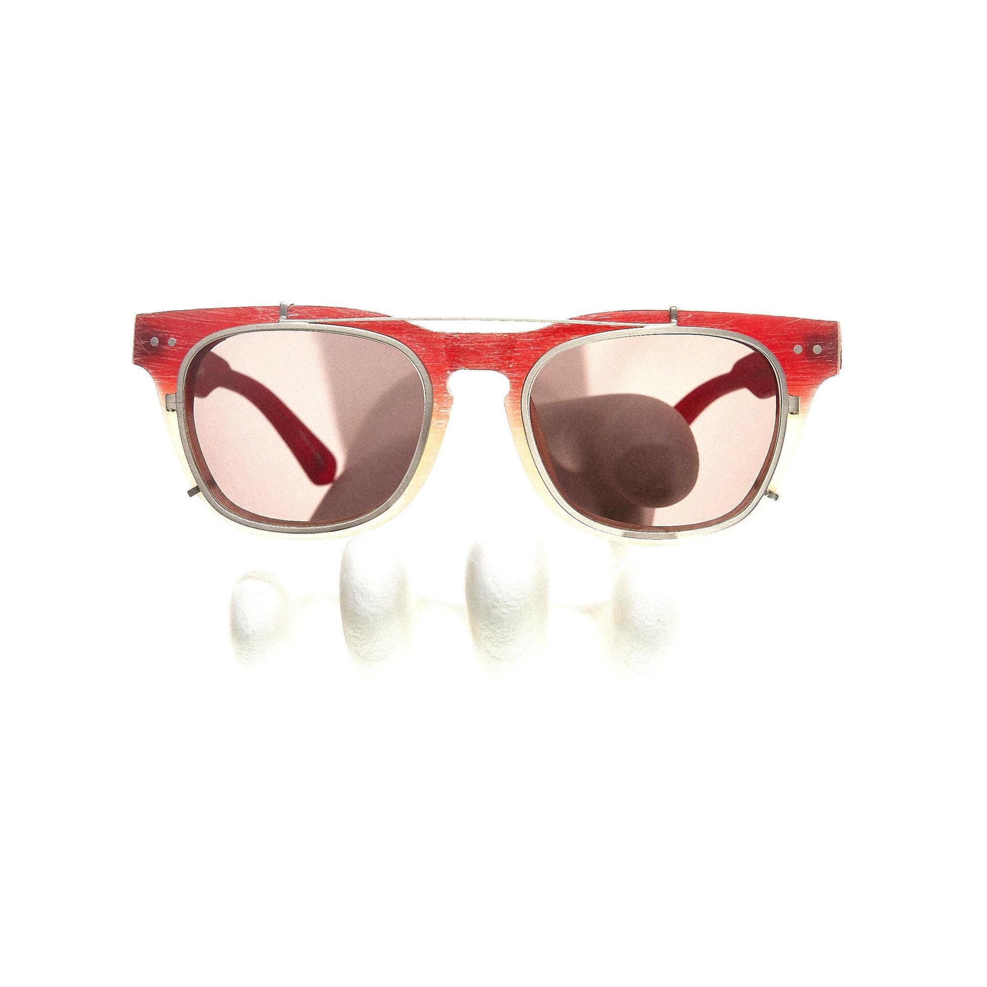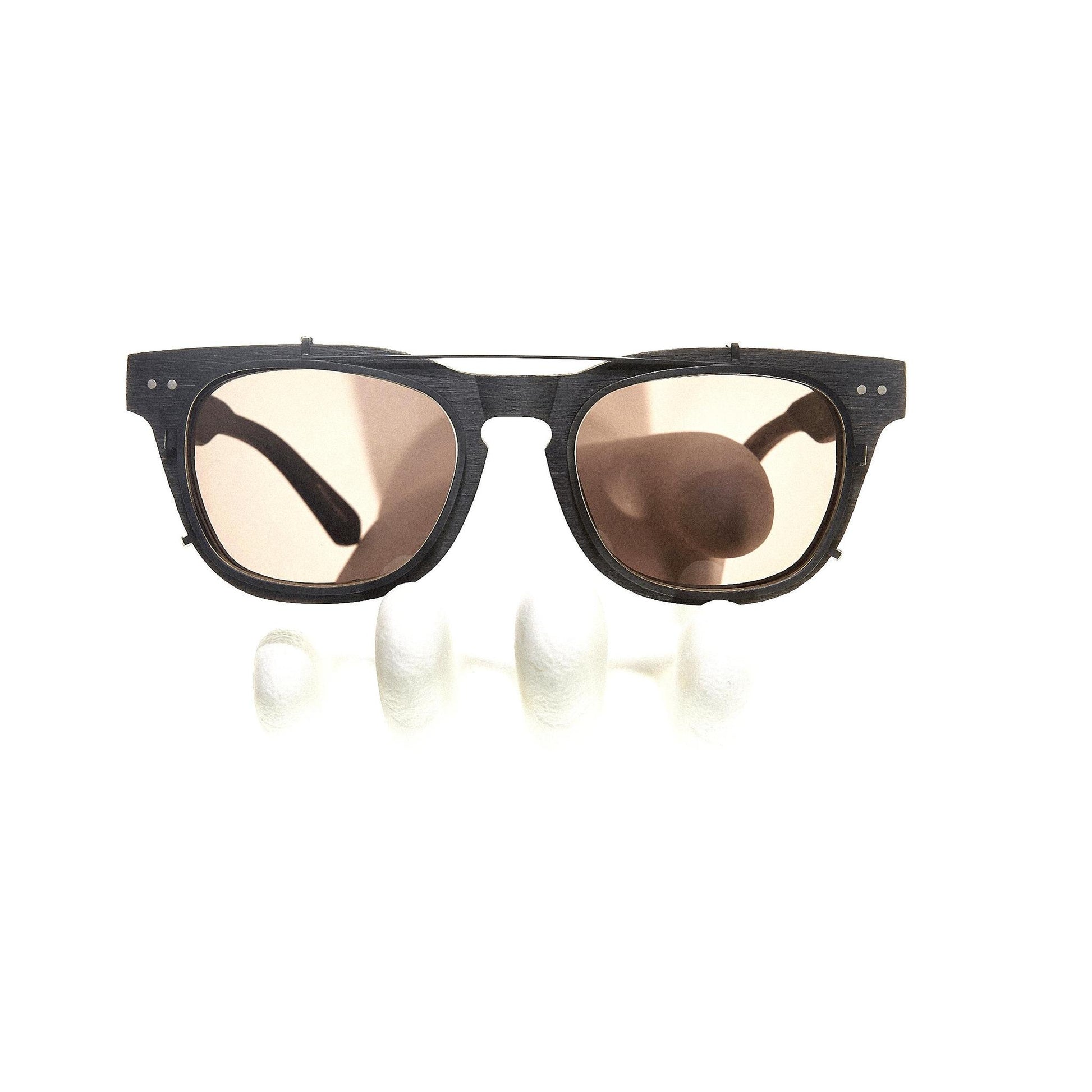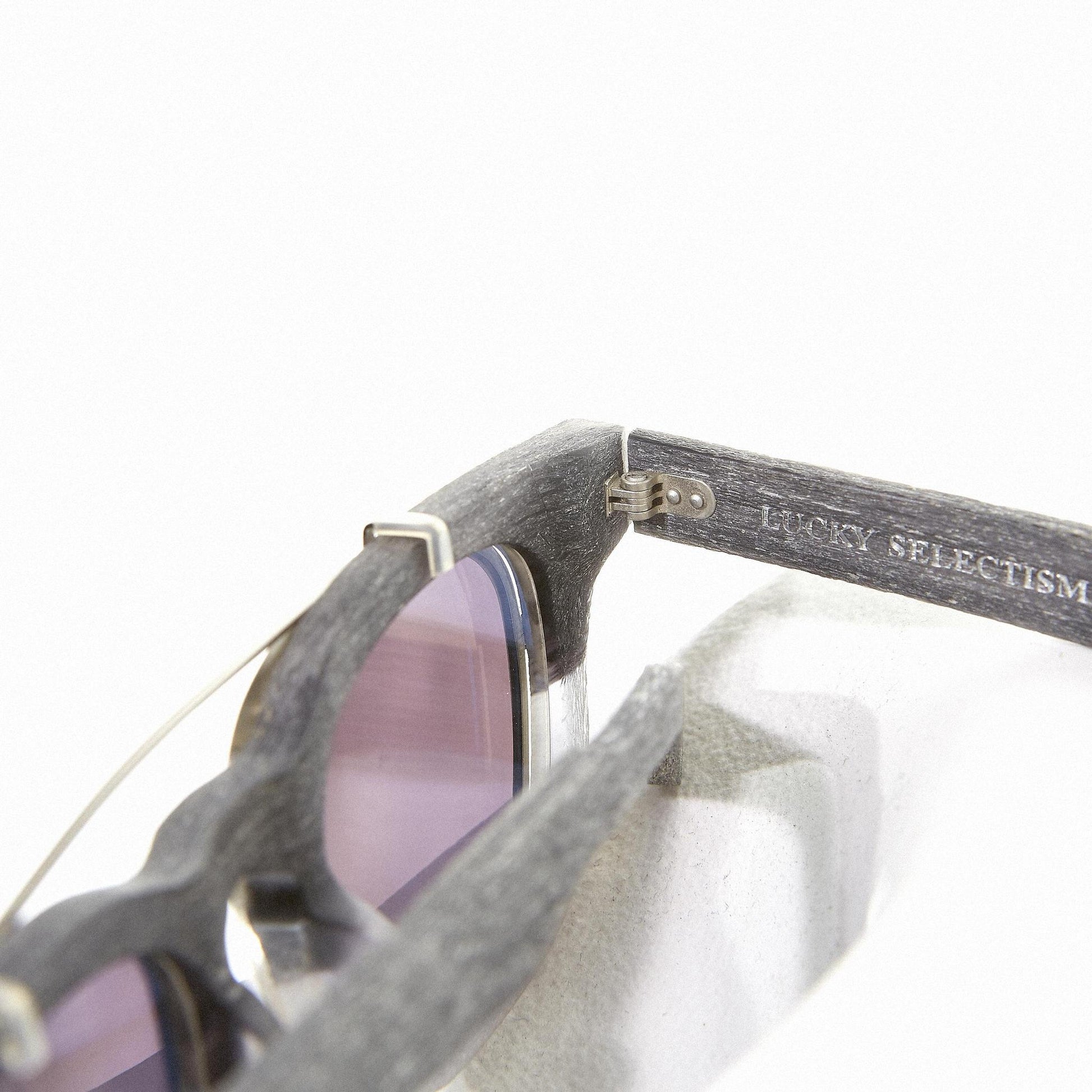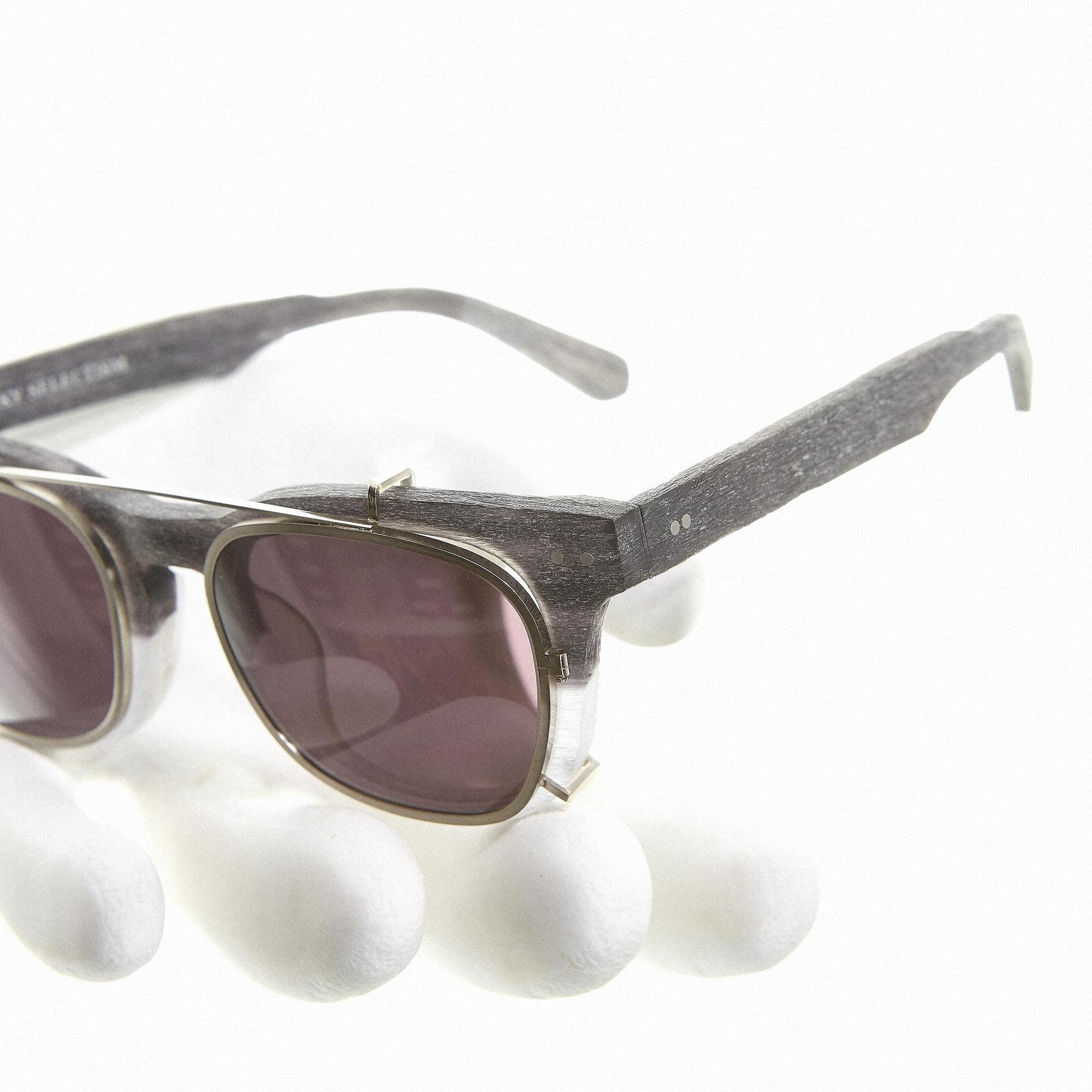 DISCOVER IVE II; Inspired by the 1950’s Golden era, a matte hand-brushed texture frame with a wooden quality touch gives a genderless and yet charismatic look. A flexible stainless clip-on gives a double brow bar silhouette along with a classic keyhole cut bridge. Bold and matte temple supports the profile of wood carving style.