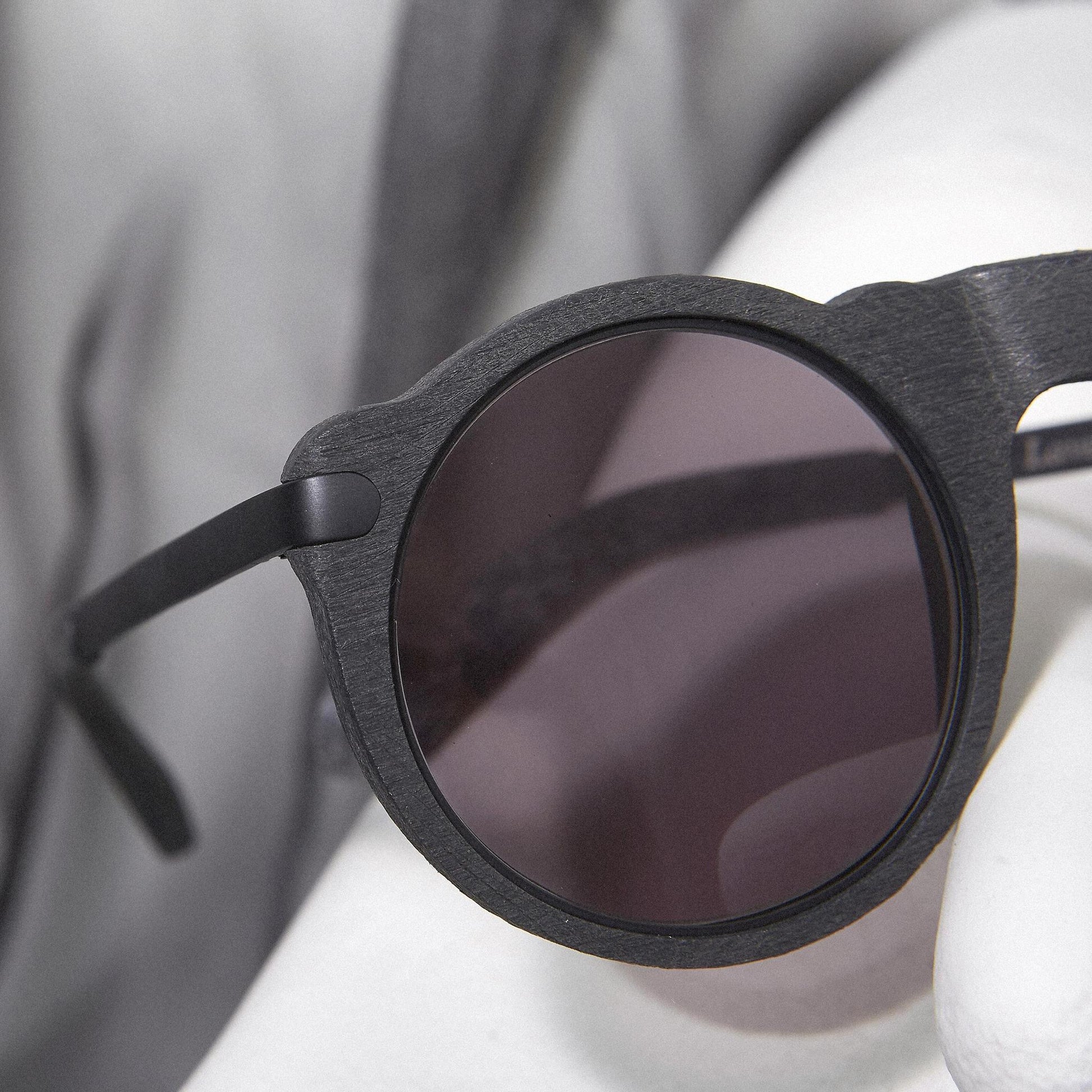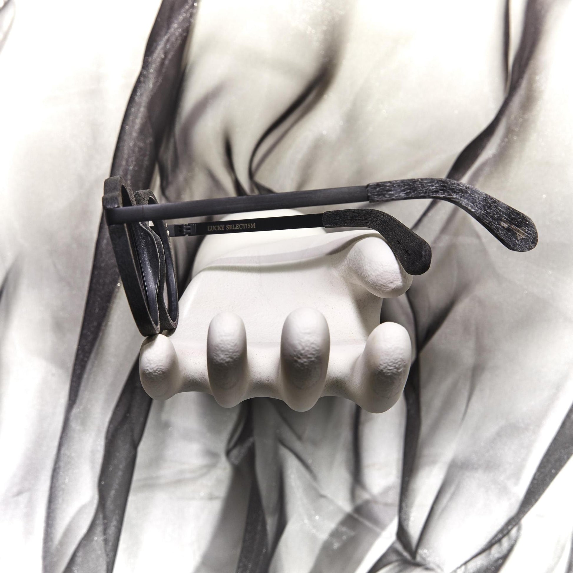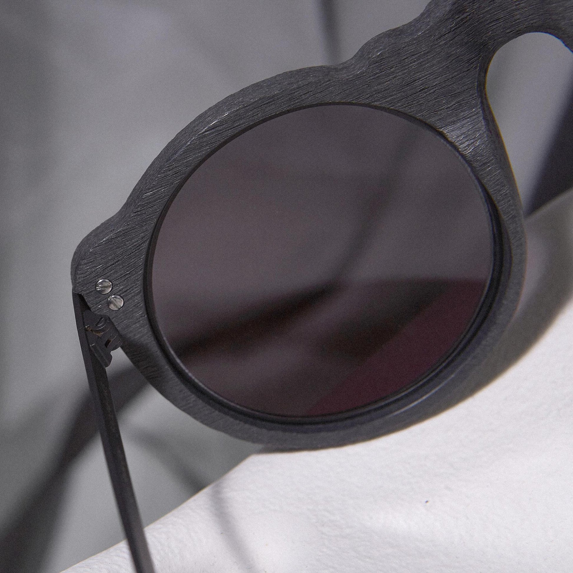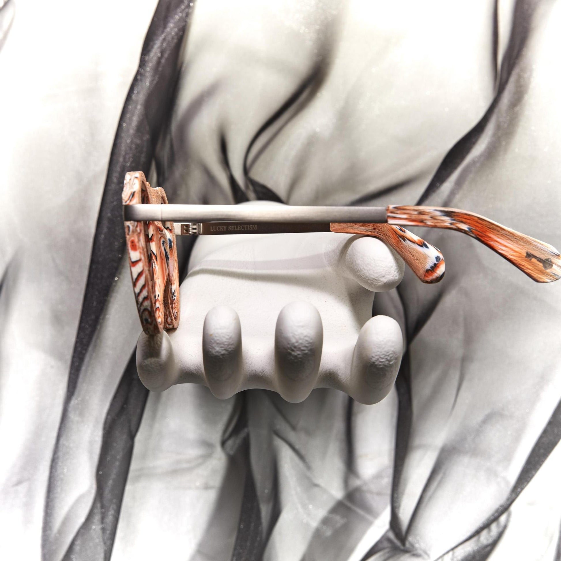 DISCOVER LAVERN; a classic pantos-shaped frame with boldly carved saddle nose bridge transforming the collapsible designed sunglass’s nose bridge shape as a unique design feature. Unconventionally cut elevated brow-bar gives an iconic look while overall matte and bold texture highlight blend effortlessly with thin matte metal temples with hand-brushed texture ends.