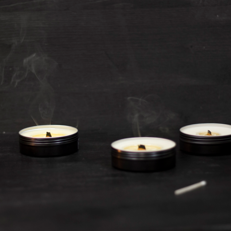 our sleek mini tin candles are perfect for bathrooms, nightstands, or adventuring around the globe. instantly cozy up your travels with your favorite scent, or simply scatter them about your home to create unique atmospheres in each room. made with a wooden wick and simple labeling, these tins will grab the attention of both minimalists and travel fanatics around the globe.