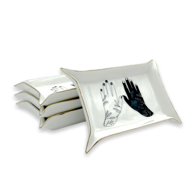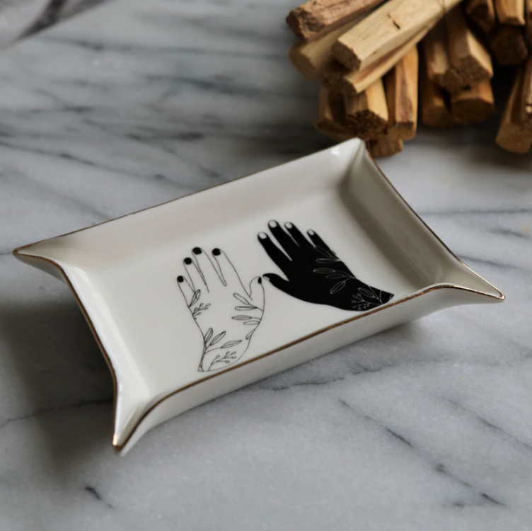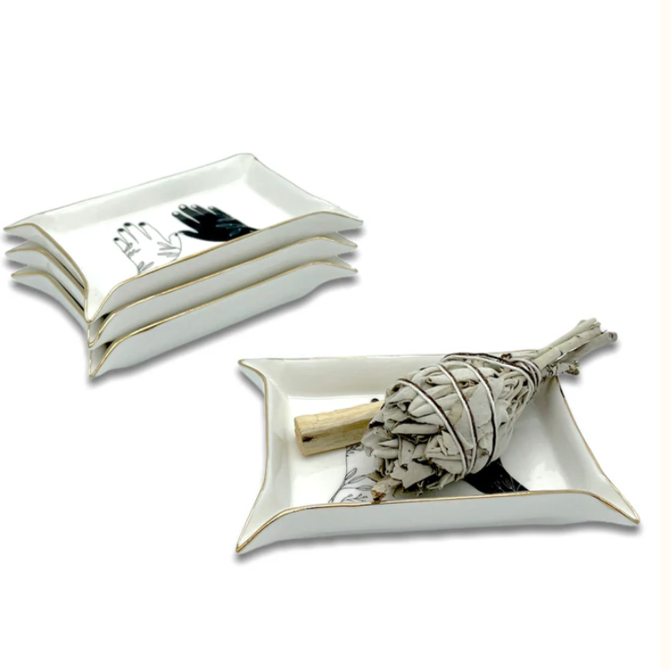 This unique little ceramic tray with pinched corners and a gold edge is perfect for holding the jewelry you wear everyday, and also functions great as a smudge tray. Keep your sage, Palo Santo, and crystals in this compact and beautiful tray.