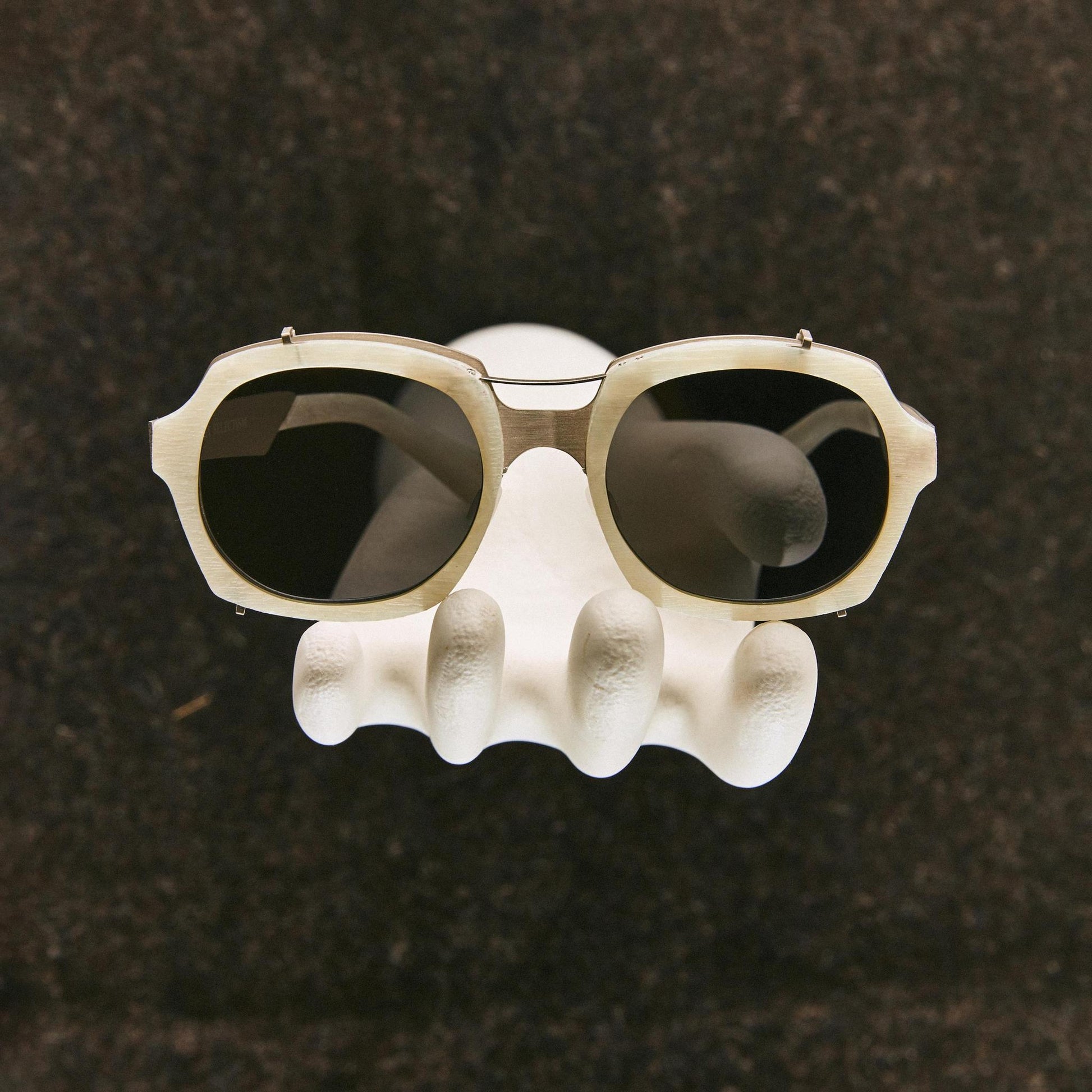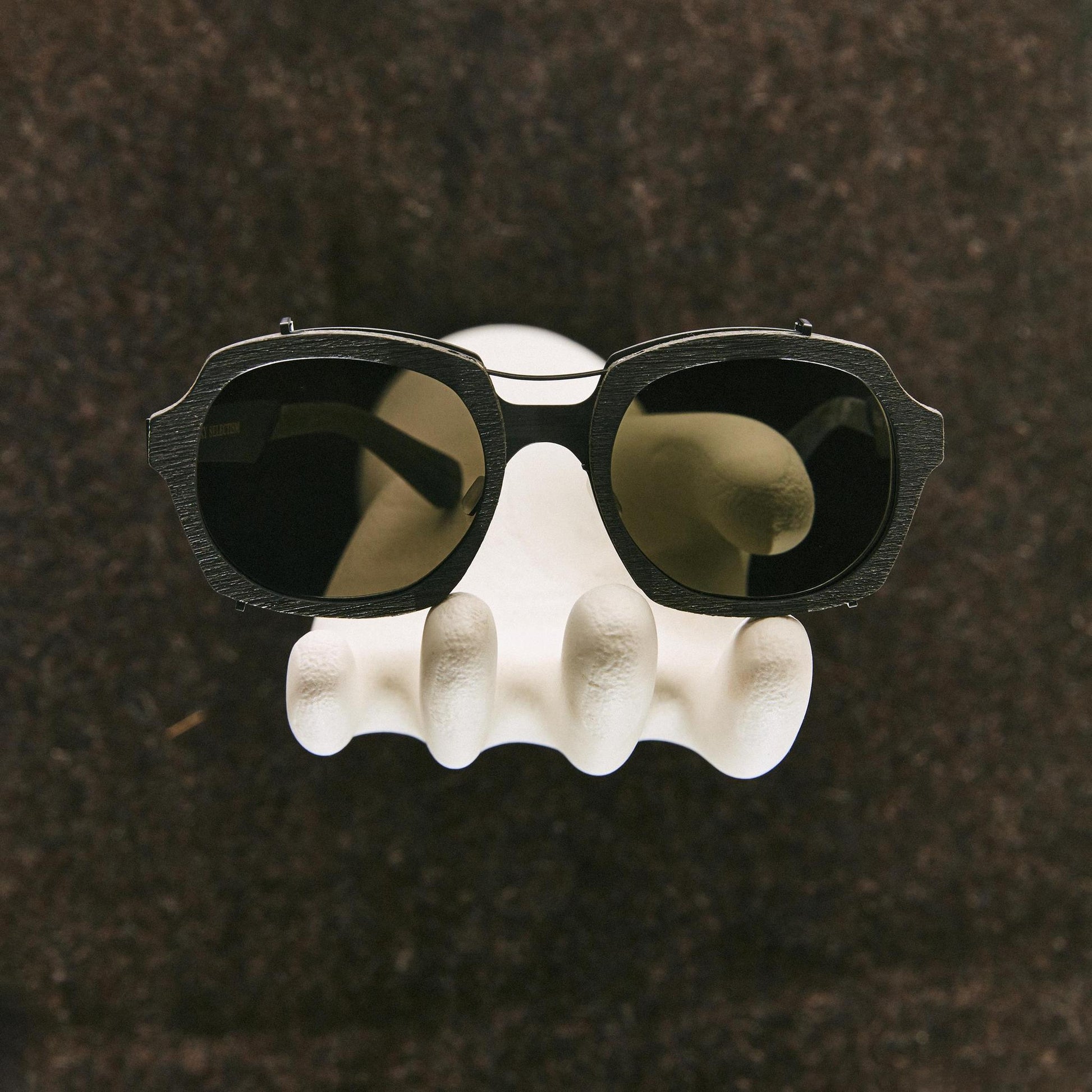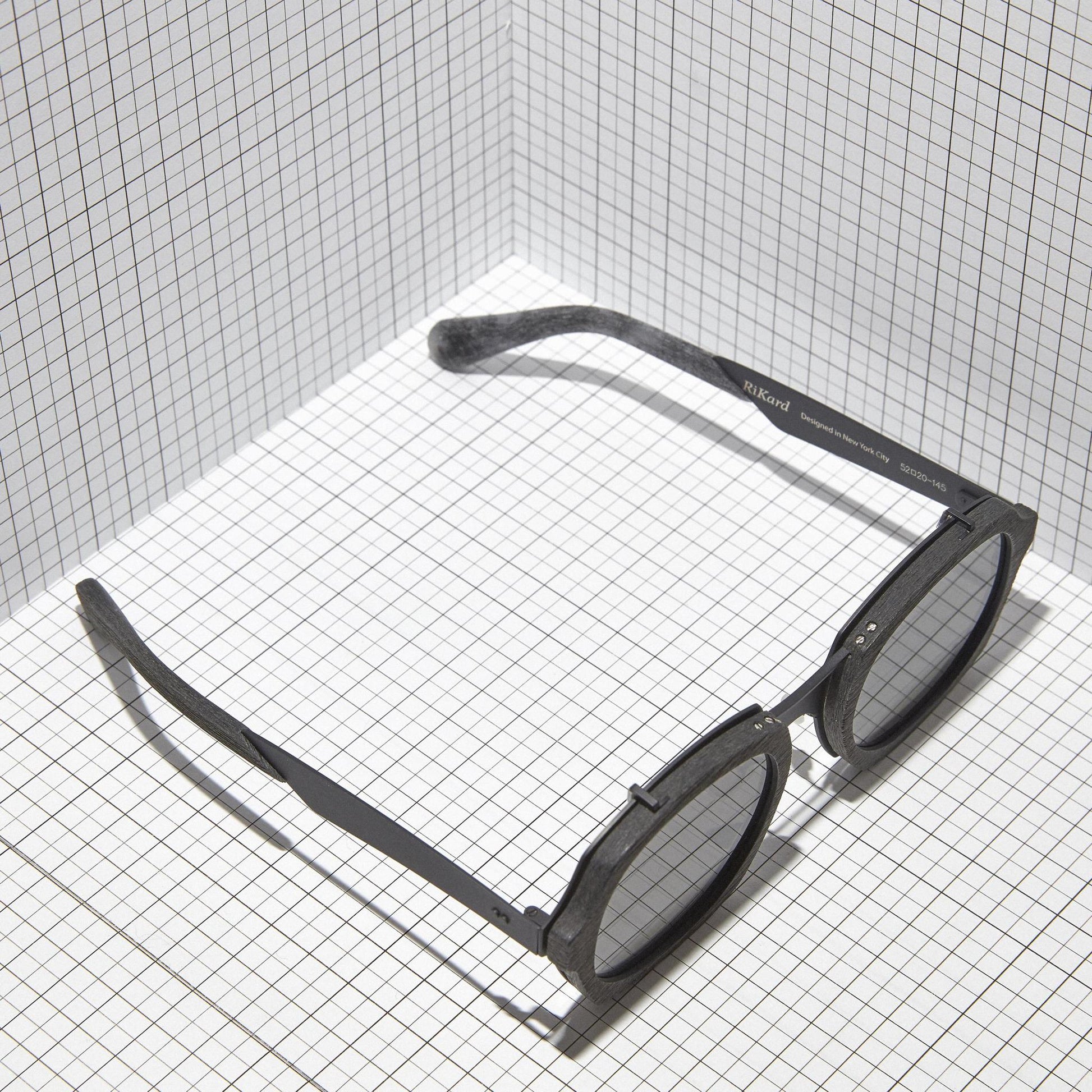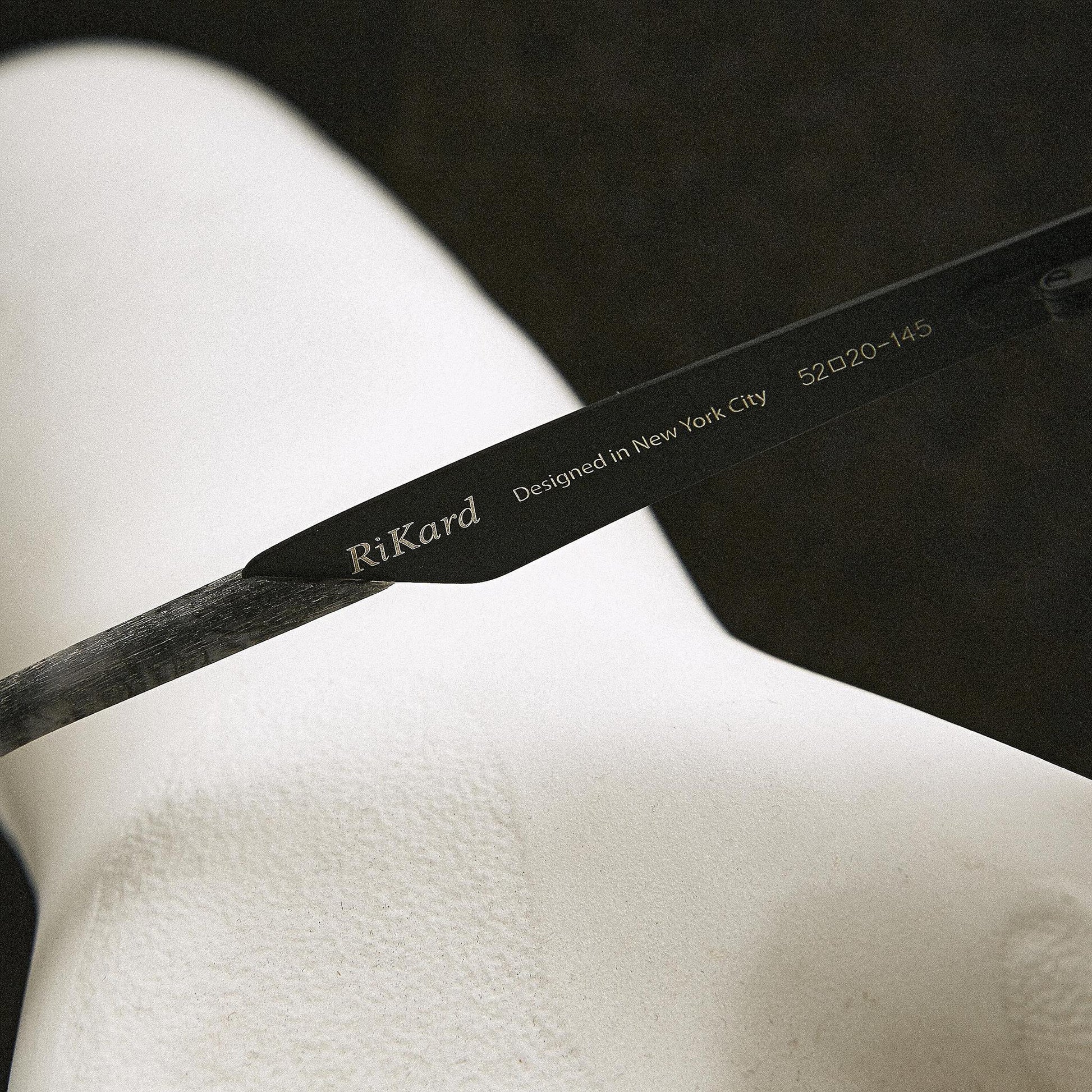 DISCOVER RIKARD; a square shaped frame with slight jutted sides. A matte horizontal cut hand-brushed texture emphasizes the high quality hand-made look. A flexible clip-on supports well with silicone nose pads and clear lens. An overall matte finished style is presented by qualities of matte metal and matte hand-brushed texture temple.