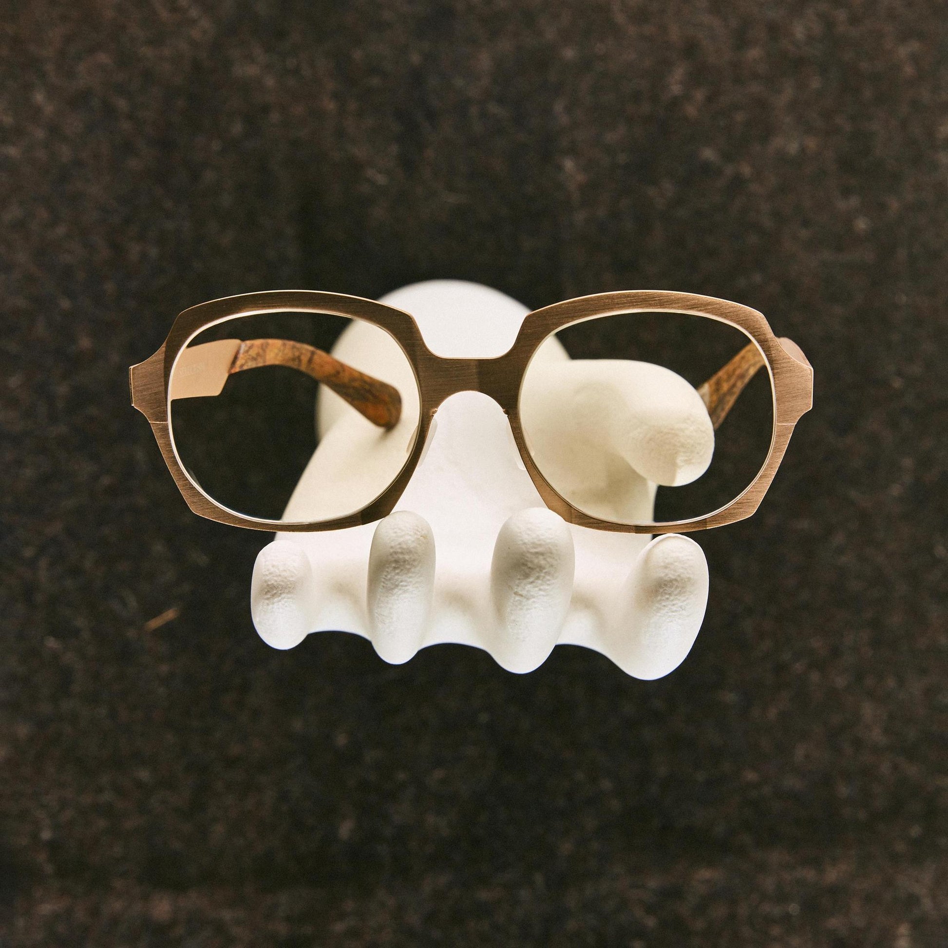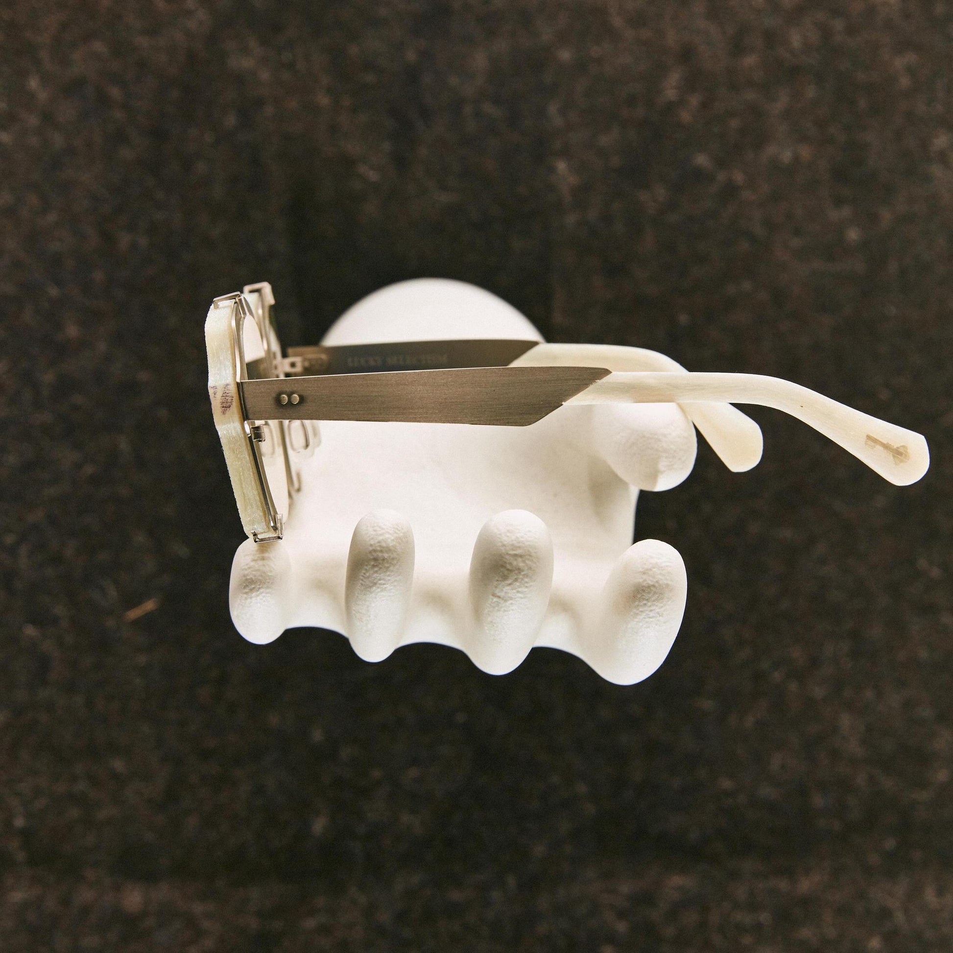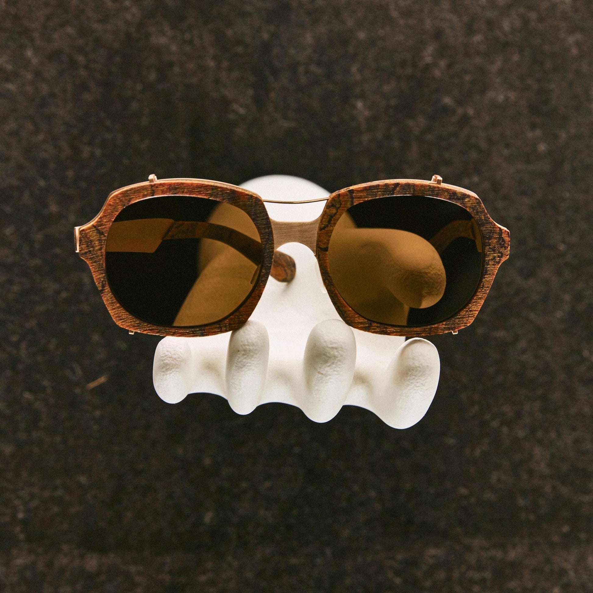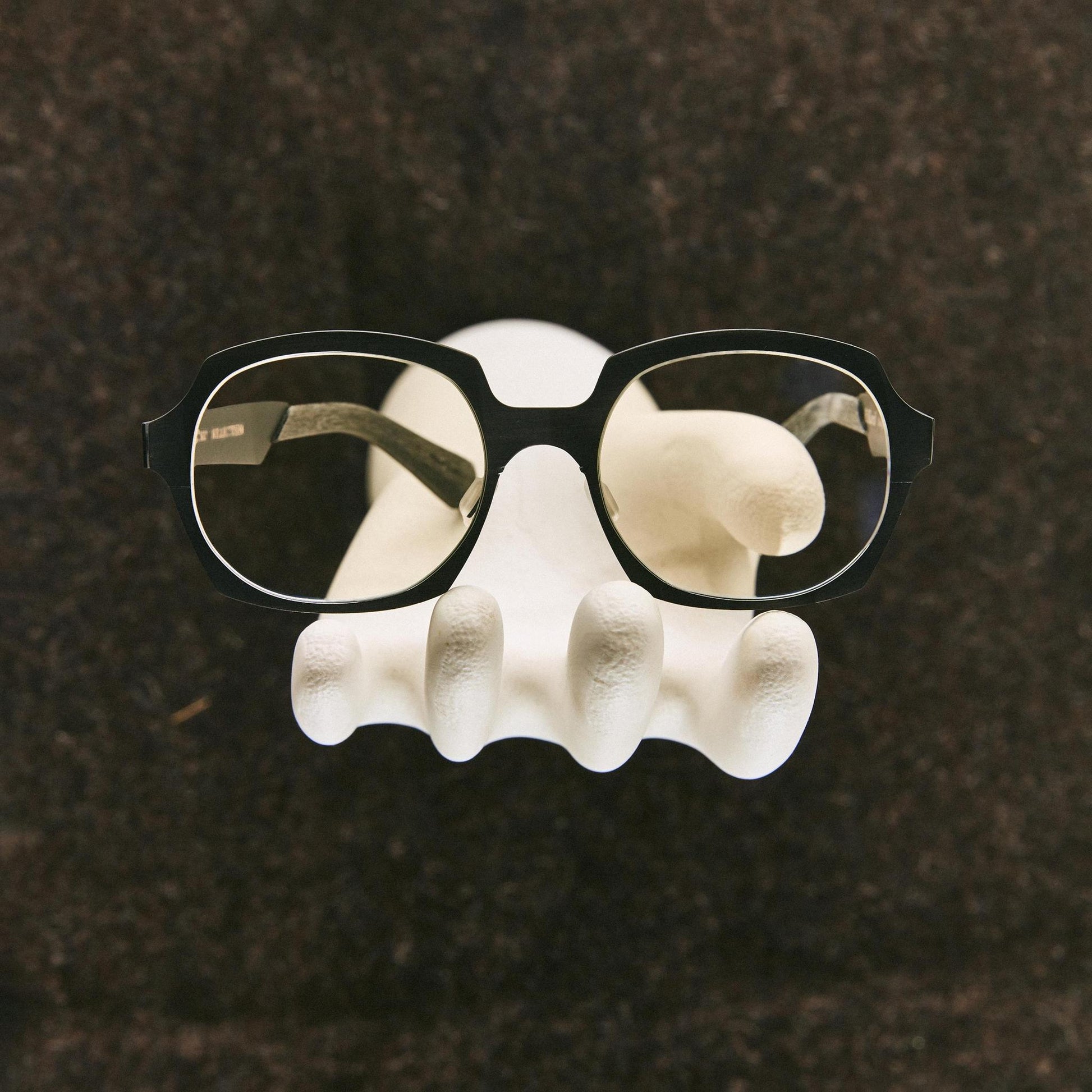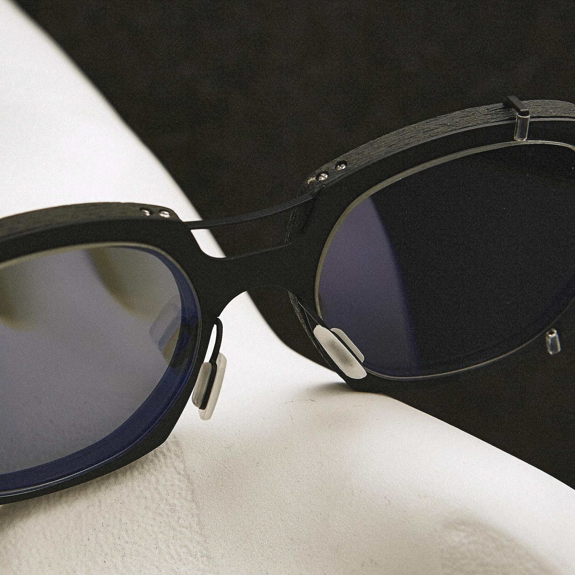 DISCOVER RIKARD; a square shaped frame with slight jutted sides. A matte horizontal cut hand-brushed texture emphasizes the high quality hand-made look. A flexible clip-on supports well with silicone nose pads and clear lens. An overall matte finished style is presented by qualities of matte metal and matte hand-brushed texture temple.