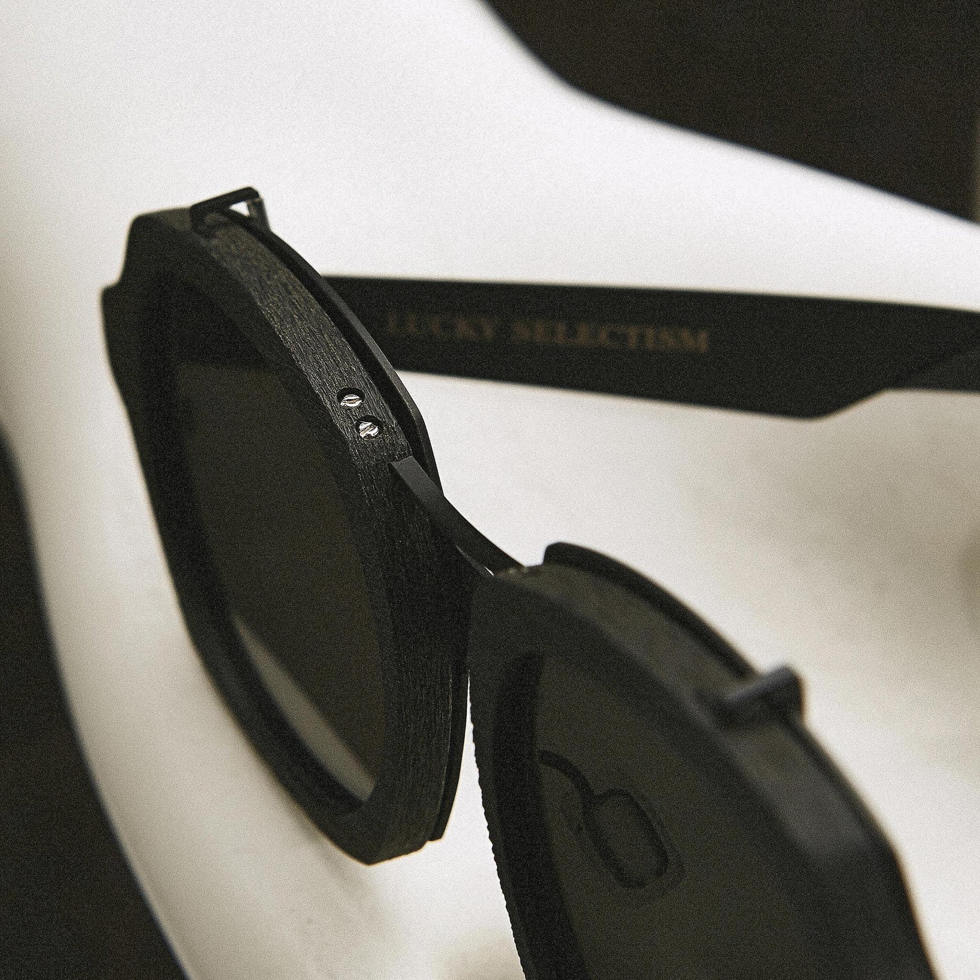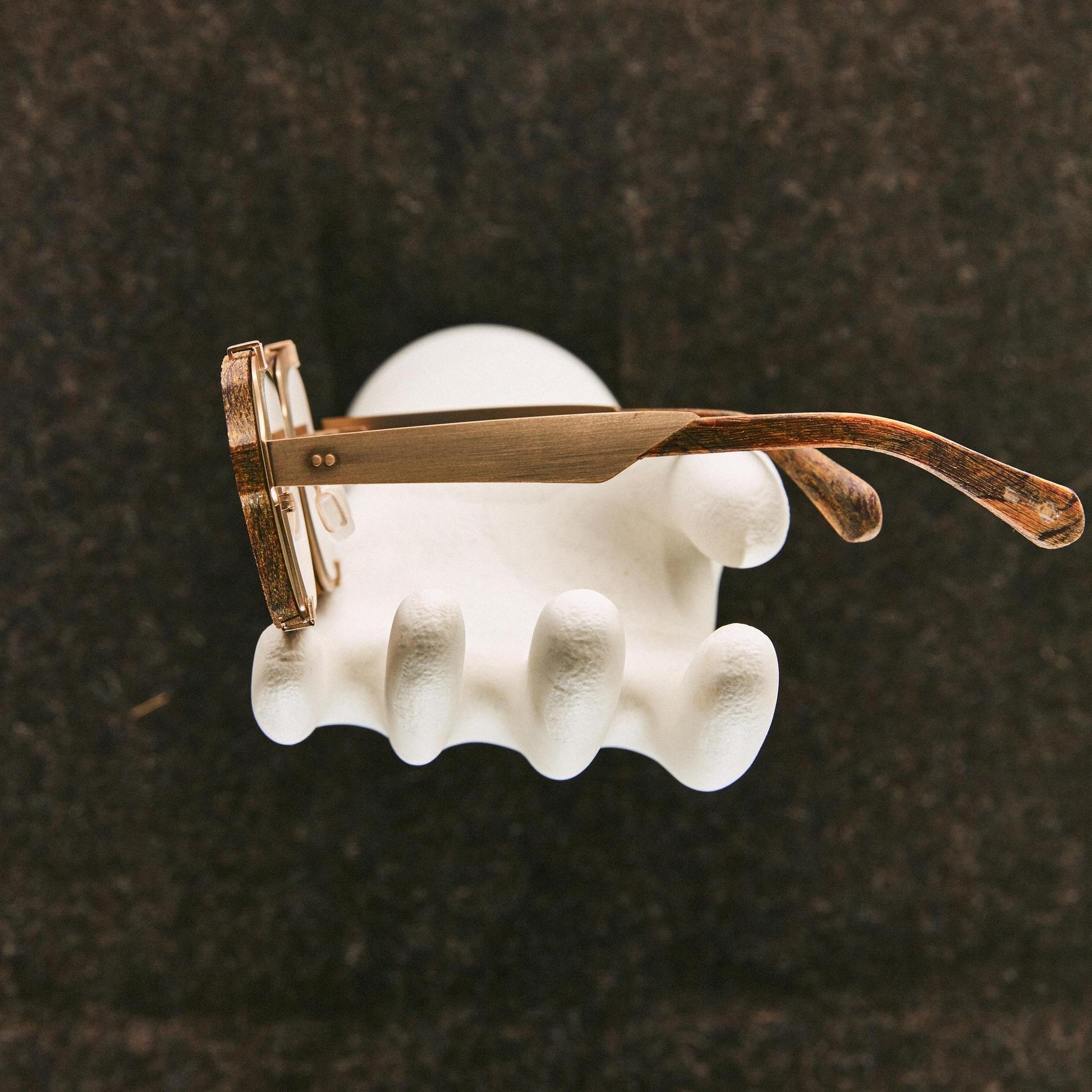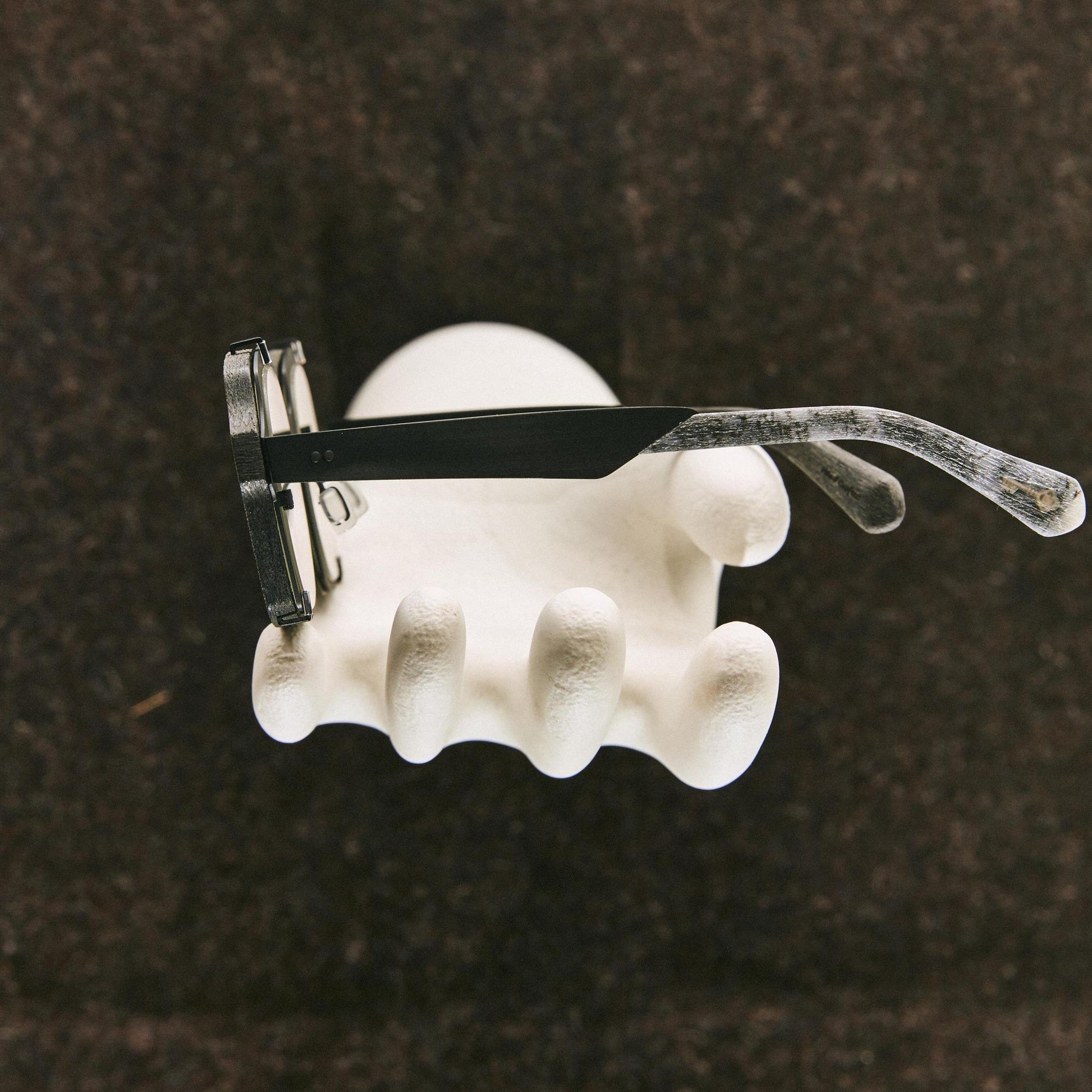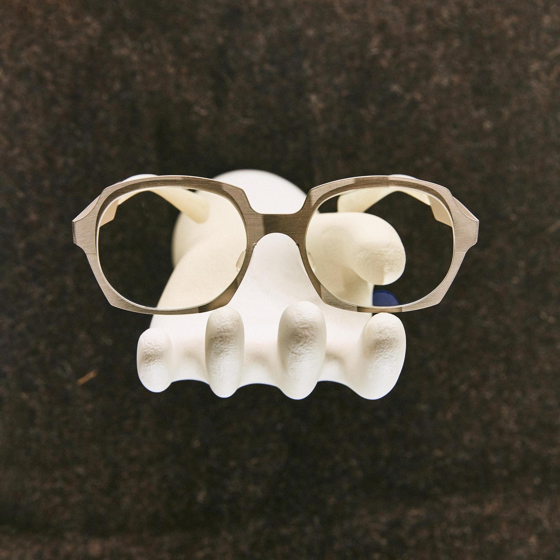 DISCOVER RIKARD; a square shaped frame with slight jutted sides. A matte horizontal cut hand-brushed texture emphasizes the high quality hand-made look. A flexible clip-on supports well with silicone nose pads and clear lens. An overall matte finished style is presented by qualities of matte metal and matte hand-brushed texture temple.