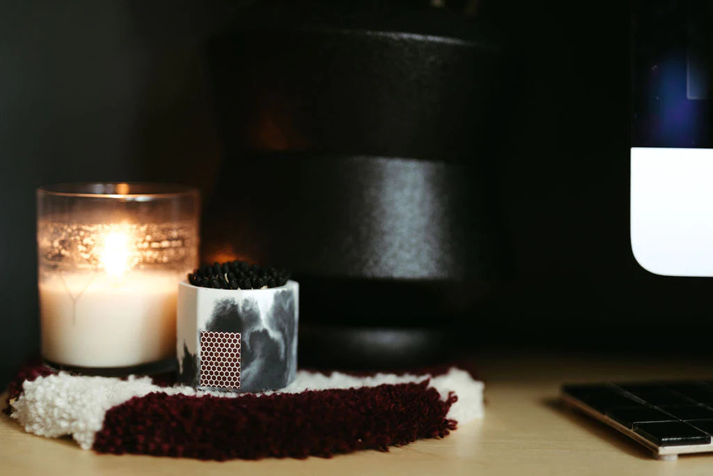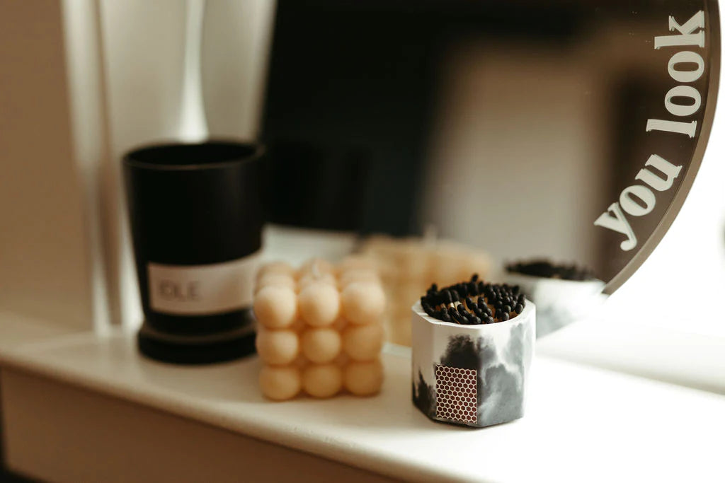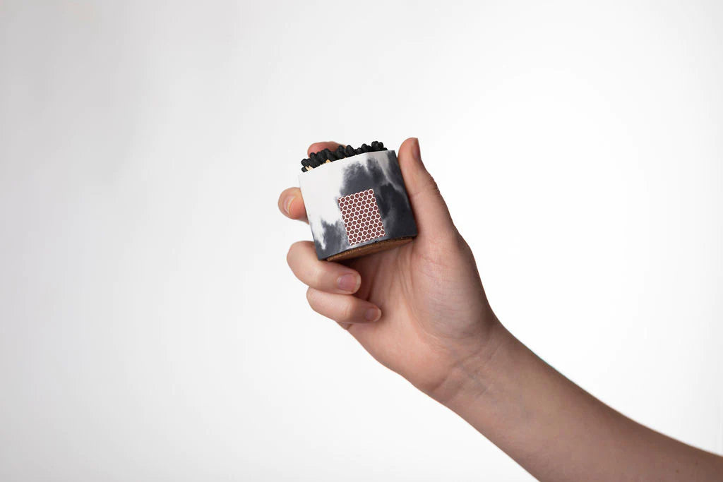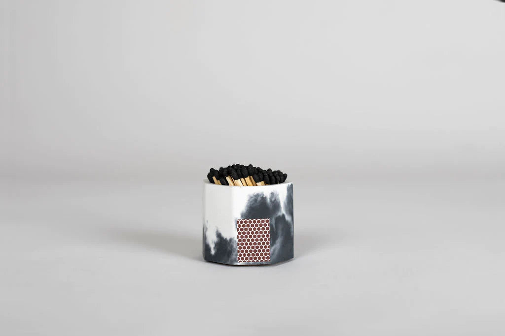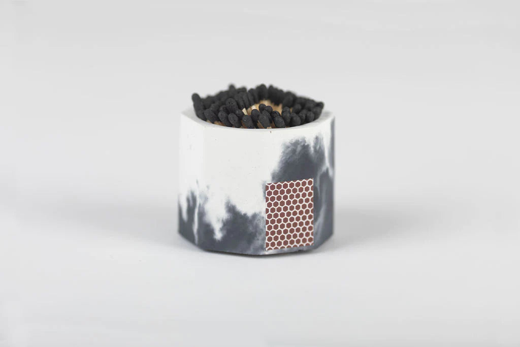 Each match stick holder is hand-poured concrete with a cork bottom to protect your surfaces. Each set comes with 70 matches included. The matches are approximately 1.85 inches. There is also a striker pad attached to the side of your holder for easy lighting.