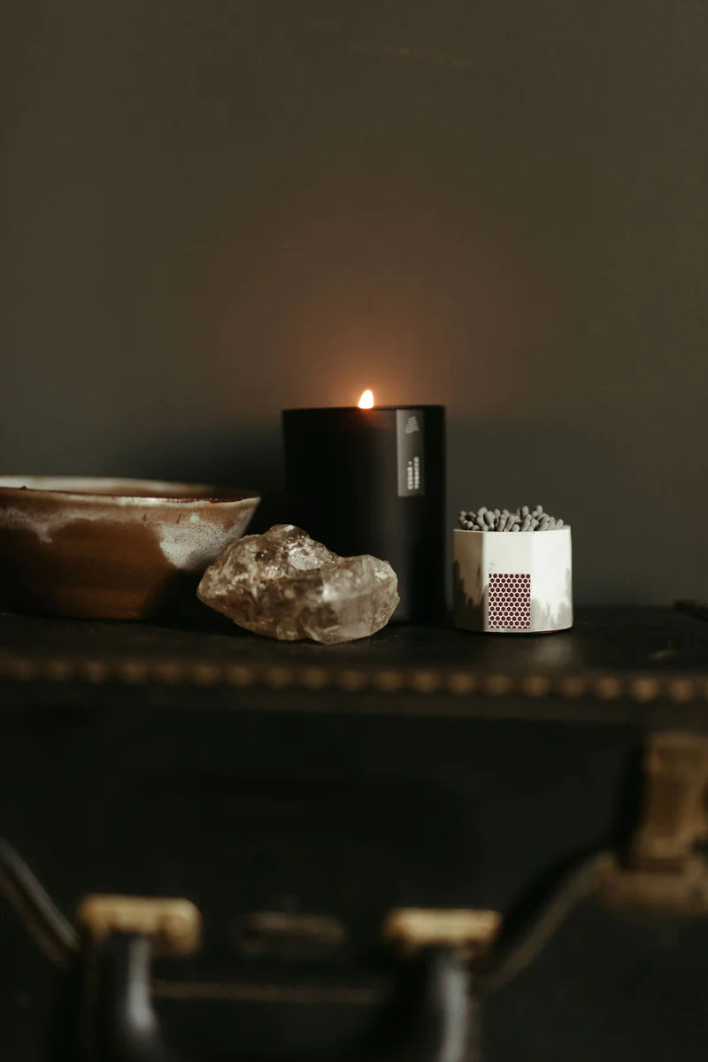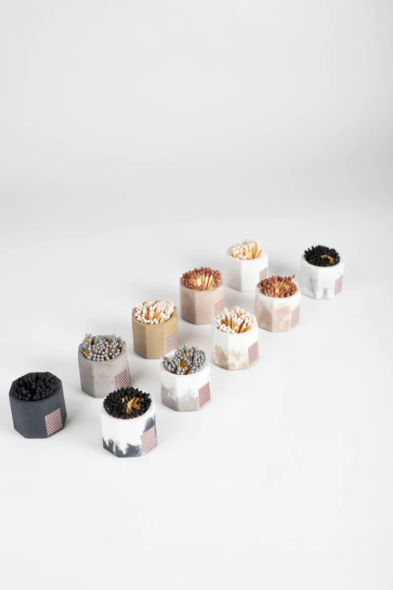 Each match stick holder is hand-poured concrete with a cork bottom to protect your surfaces. Each set comes with 70 matches included. The matches are approximately 1.85 inches. There is also a striker pad attached to the side of your holder for easy lighting.