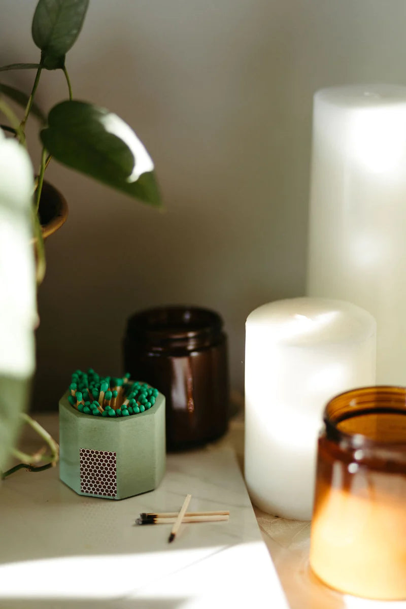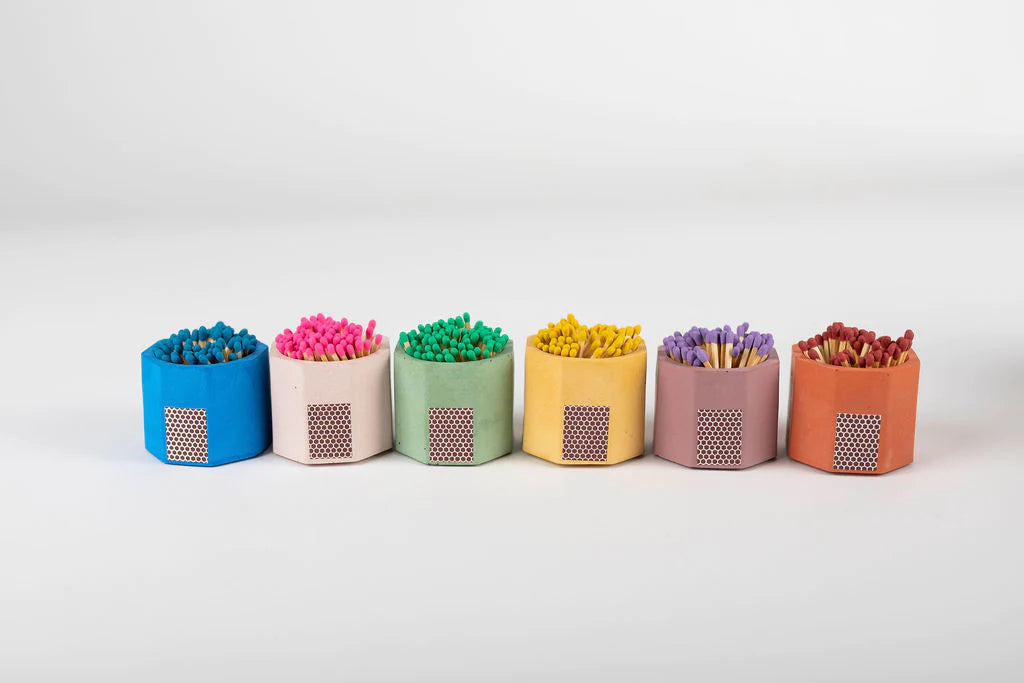 Each match stick holder is hand-poured concrete with a cork bottom to protect your surfaces. Each set comes with 70 matches included. The matches are approximately 1.85 inches. There is also a striker pad attached to the side of your holder for easy lighting.
