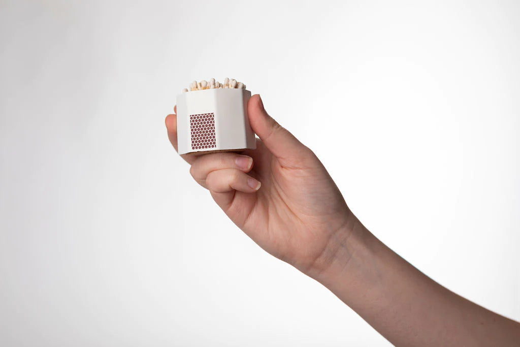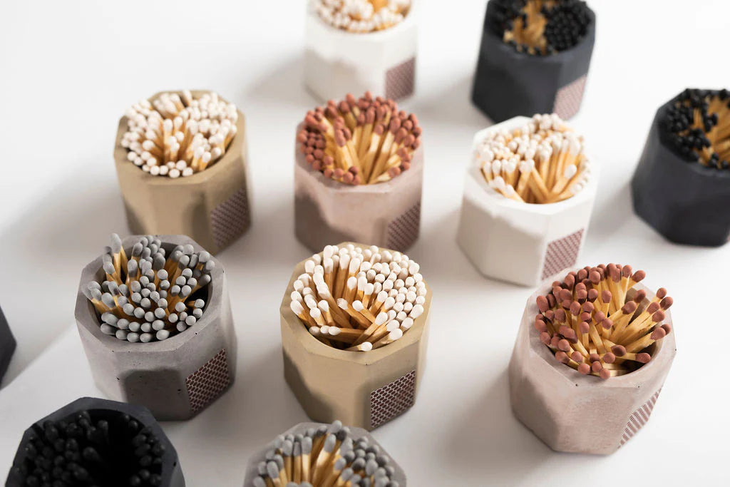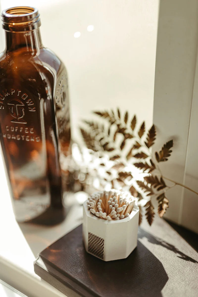 Each match stick holder is hand-poured concrete with a cork bottom to protect your surfaces. Each set comes with 70 matches included. The matches are approximately 1.85 inches. There is also a striker pad attached to the side of your holder for easy lighting.