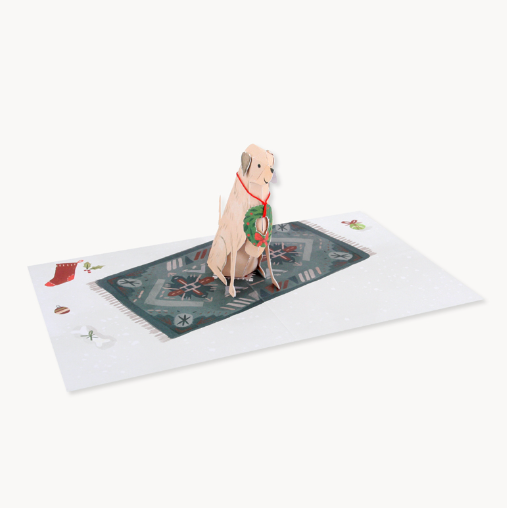 Our Pure Alchemy Collection features cheeky salutations and pop-ups mixed with intricate laser-cutting. A festive golden retriever carries a holly wreath around his neck.